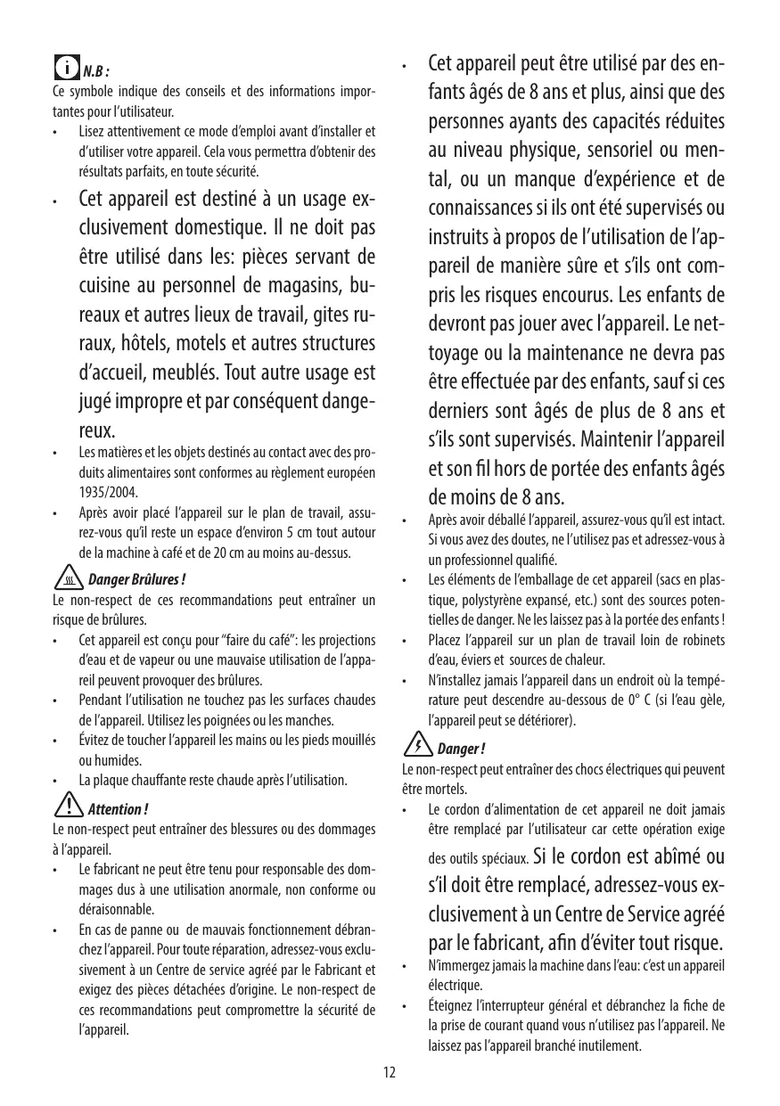 Le non-respect de ces recommandations peut entraîner un risque de brûlures. • Cet appareil est conçu pour “faire du café”: les projections d’eau et de vapeur ou une mauvaise utilisation de l’appareil peuvent provoquer des brûlures. • Pendant l’utilisation ne touchez pas les surfaces chaudes de l’appareil. Utilisez les poignées ou les manches. • Évitez de toucher l’appareil les mains ou les pieds mouillés ou humides. • La plaque chauffante reste chaude après l’utilisation.