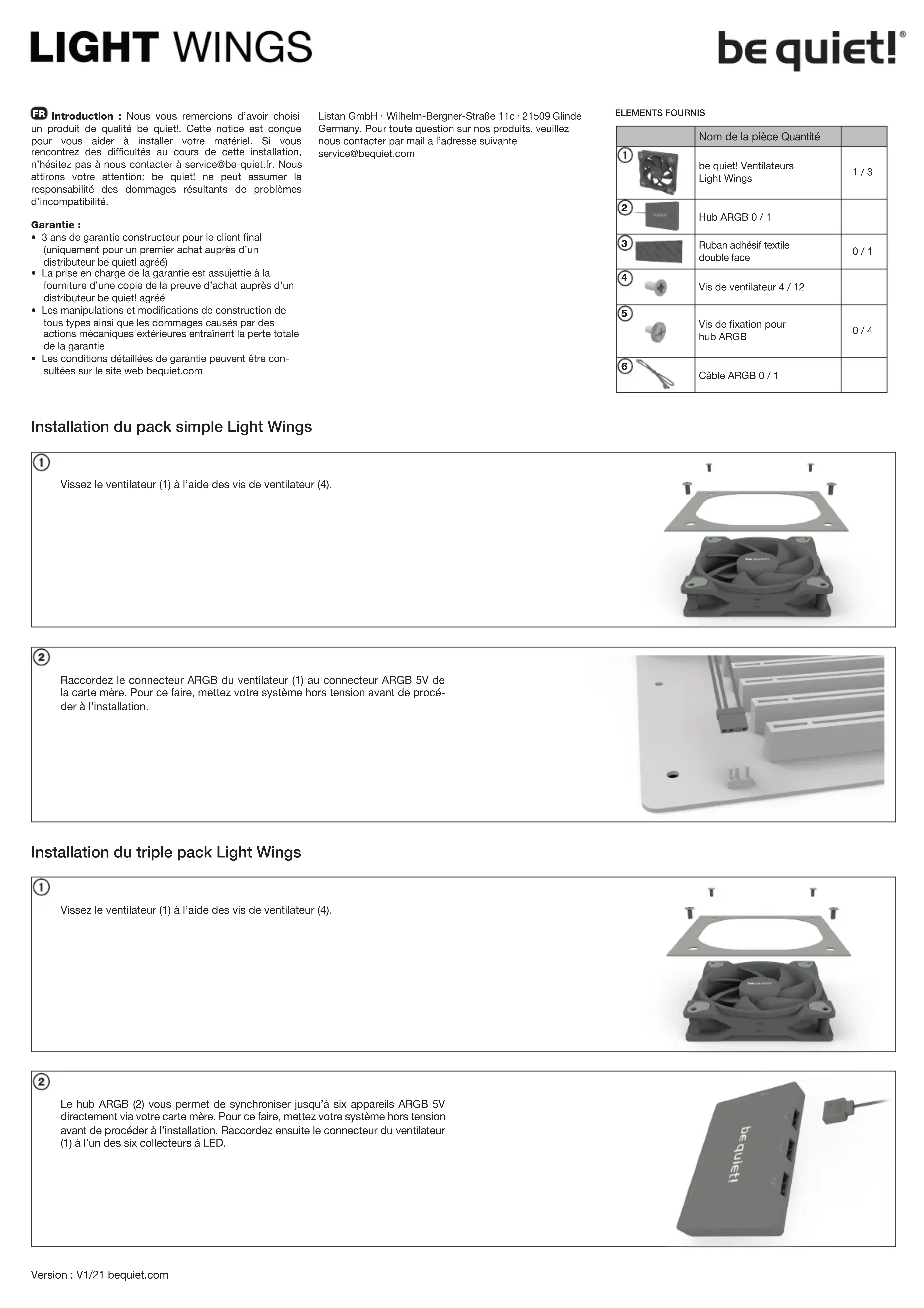 21509 Glinde Germany. Pour toute question sur nos produits, veuillez nous contacter par mail a l’adresse suivante service@bequiet.com Nom de la pièce Quantité be quiet! Ventilateurs Light Wings 1 / 3 Hub ARGB 0 / 1 Ruban adhésif textile double face 0 / 1 Vis de ventilateur 4 / 12 Vis de fixation pour hub ARGB 0 / 4 Câble ARGB 0 / 1 Version : V1/21 bequiet.com