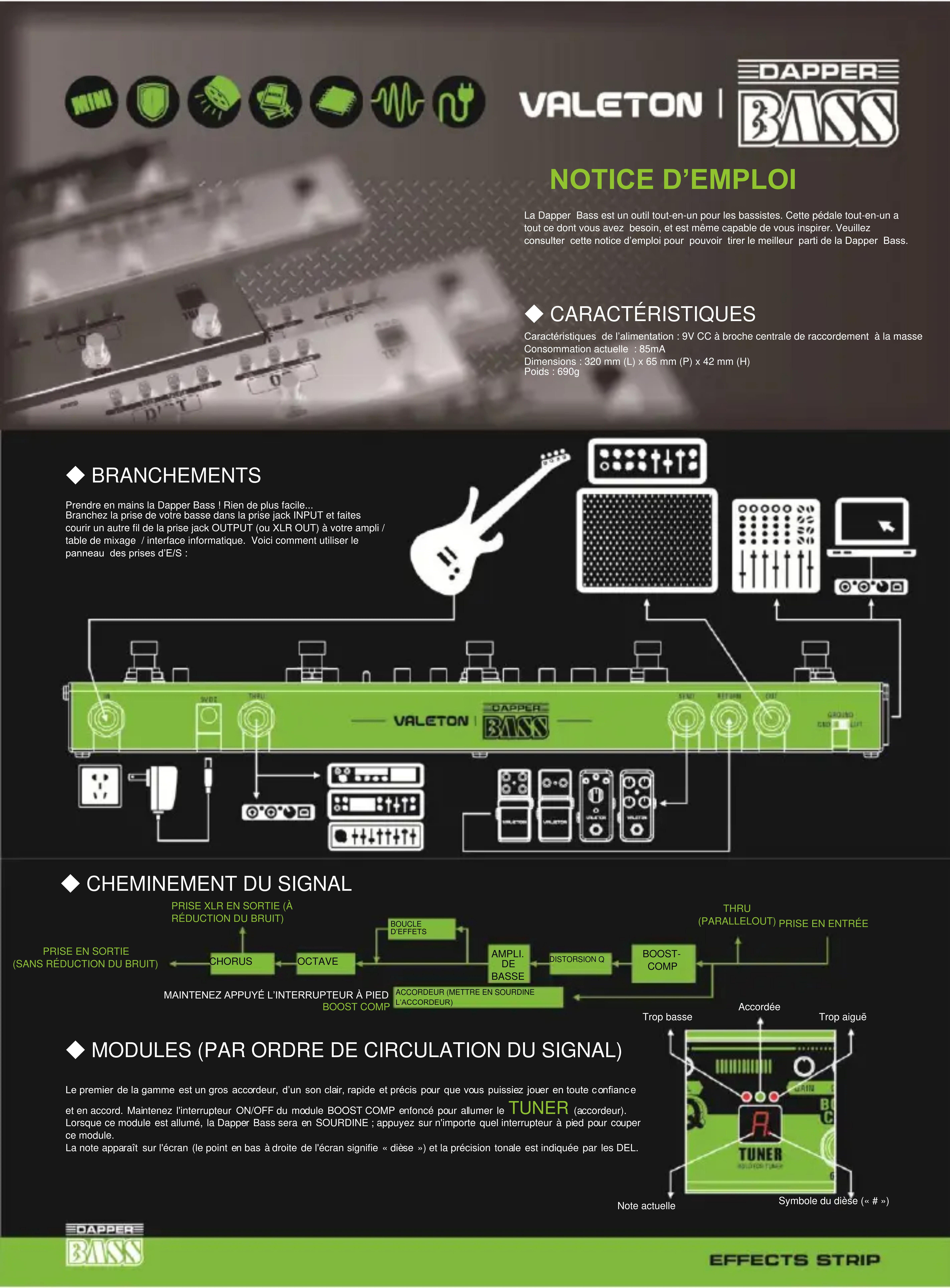 L’ACCORDEUR) ◆ CARACTÉRISTIQUES Caractéristiques de l’alimentation : 9V CC à broche centrale de raccordement à la masse Consommation actuelle : 85mA Dimensions : 320 mm (L) x 65 mm (P) x 42 mm (H) Poids : 690g ◆ BRANCHEMENTS Prendre en mains la Dapper Bass ! Rien de plus facile... Branchez la prise de votre basse dans la prise jack INPUT et faites courir un autre fil de la prise jack OUTPUT (ou XLR OUT) à votre ampli / table de mixage / interface informatique. Voici comment utiliser le panneau des prises d’E/S : ◆ MODULES (PAR ORDRE DE CIRCULATION DU SIGNAL) Trop basse Accordée Trop aiguë Note actuelle Symbole du dièse (« # ») DISTORSION Q BOUCLE D’EFFETSL’BASS AMP de la Dapper vous procure la basse dont vous avez besoin pour chaque style de musique. L'égaliseur est d’or, à sons clairs et très réactif même lorsque le gain est augmenté. Utilisez le module OCTAVE, monophonique intégralement analogique, pour renforcer vos basses fréquences, créer des leads synthétiques ou inventer de façon inédite. Le contrôle individuel des octaves et du son sans effet garantit une inspiration maximale. Boutons : DRY : Contrôle le niveau du signal sans effet OCT 1 : Contrôle le volume du son une octave plus bas que le son d'origine OCT 2 : Contrôle le volume du son deux octaves plus bas que le son d'origine BOOST COMP est une combinaison booster-compresseur. Les boutons « set-to-forget » la rendent tout simplement diabolique. Le compresseur a cette saveur chaleureuse d'Opto Com accompagné d’un sustain naturel et d’une attaque qui a du punch, quant au booster (l’amplification), il vous accorde +12 dB de gain maximum à aigus et profondes graves supplémentaires Boutons : DEPTH : Contrôle l’ampleur / dimension de l’effet de chorus