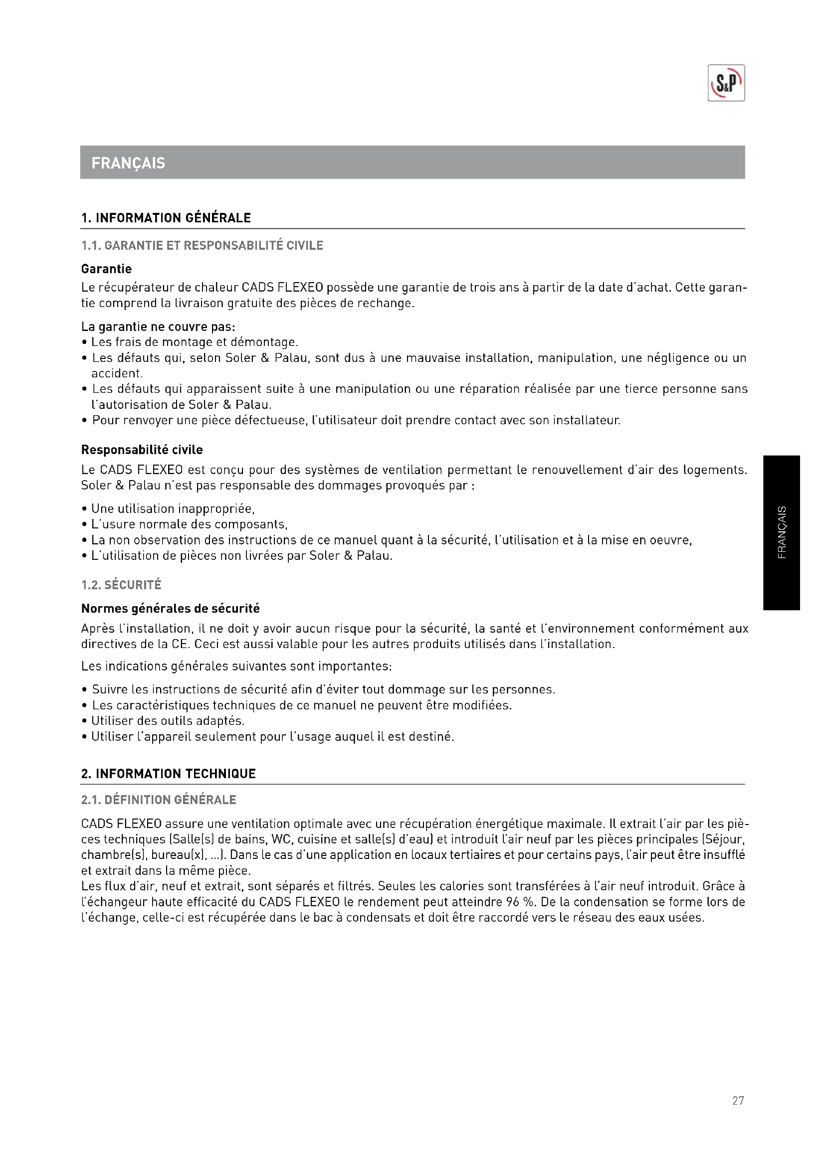 - Pour renvoyer une pièce défectueuse, l’utilisateur doit prendre contact avec son installateur. Responsabilité civile Le CADS FLEXEO est conçu pour des systèmes de ventilation permettant le renouvellement d’air des logements. Soler & Palau n’est pas responsable des dommages provoqués par :