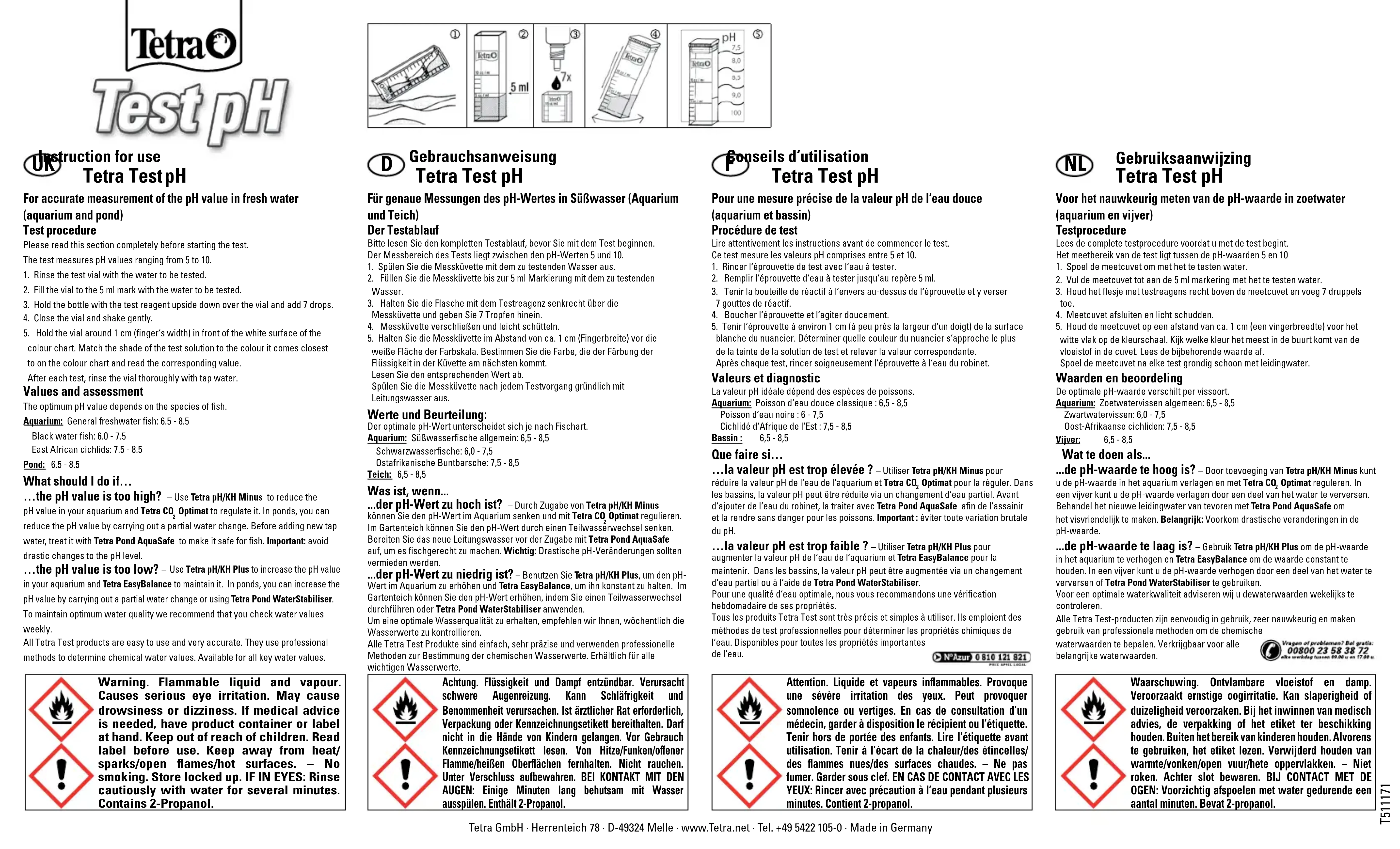 Attention. Liquide et vapeurs inflammables. Provoque une sévère irritation des yeux. Peut provoquer somnolence ou vertiges. En cas de consultation d’un médecin, garder à disposition le récipient ou l’étiquette. Tenir hors de portée des enfants. Lire l’étiquette avant utilisation. Tenir à l’écart de la chaleur/des étincelles/ des flammes nues/des surfaces chaudes. – Ne pas fumer. Garder sous clef. EN CAS DE CONTACT AVEC LES YEUX: Rincer avec précaution à l’eau pendant plusieurs minutes. Contient 2-propanol. Conseils d‘utilisation Tetra Test pH Pour une mesure précise de la valeur pH de l‘eau douce (aquarium et bassin) Procédure de test Lire attentivement les instructions avant de commencer le test. Ce test mesure les valeurs pH comprises entre 5 et 10. 1. Rincer l‘éprouvette de test avec l‘eau à tester. 2. Remplir l‘éprouvette d‘eau à tester jusqu‘au repère 5 ml. 3. Tenir la bouteille de réactif à l‘envers au-dessus de l‘éprouvette et y verser 7 gouttes de réactif. 4. Boucher l‘éprouvette et l‘agiter doucement. 5. Tenir l‘éprouvette à environ 1 cm (à peu près la largeur d‘un doigt) de la surface blanche du nuancier. Déterminer quelle couleur du nuancier s‘approche le plus de la teinte de la solution de test et relever la valeur correspondante. Après chaque test, rincer soigneusement l‘éprouvette à l‘eau du robinet. Valeurs et diagnostic La valeur pH idéale dépend des espèces de poissons. Aquarium: Poisson d‘eau douce classique : 6,5 - 8,5 Poisson d‘eau noire : 6 - 7,5 Cichlidé d‘Afrique de l‘Est : 7,5 - 8,5 Bassin : 6,5 - 8,5 Que faire si… …la valeur pH est trop élevée ? – Utiliser Tetra pH/KH Minus pour réduire la valeur pH de l‘eau de l‘aquarium et Tetra CO Optimat pour la réguler. Dans les bassins, la valeur pH peut être réduite via un changement d‘eau partiel. Avant d‘ajouter de l‘eau du robinet, la traiter avec Tetra Pond AquaSafe afin de l‘assainir et la rendre sans danger pour les poissons. Important : éviter toute variation brutale du pH. …la valeur pH est trop faible ? – Utiliser Tetra pH/KH Plus pour augmenter la valeur pH de l‘eau de l‘aquarium et Tetra EasyBalance pour la maintenir. Dans les bassins, la valeur pH peut être augmentée via un changement d‘eau partiel ou à l‘aide de Tetra Pond WaterStabiliser. Pour une qualité d‘eau optimale, nous vous recommandons une vérification hebdomadaire de ses propriétés. Tous les produits Tetra Test sont très précis et simples à utiliser. Ils emploient des méthodes de test professionnelles pour déterminer les propriétés chimiques de l‘eau. Disponibles pour toutes les propriétés importantes de l‘eau.