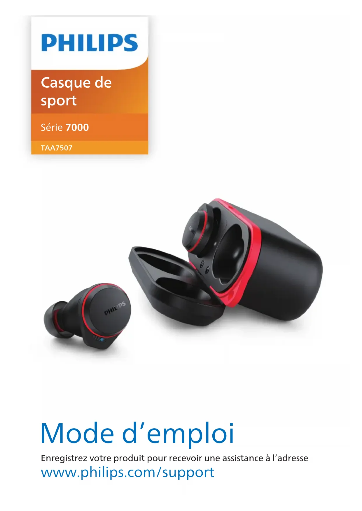 Enregistrez votre produit pour recevoir une assistance à l’adresse www.philips.com/support Mode d’emploi Casque de sport Série7000 TAA7507Tables des matières 1 Instructions de sécurité importantes 2 Sécurité auditive 2 Informations générales 2 2 Vos oreillettes True Wireless 3 Contenu de la boîte 3 Autres appareils 3 Aperçu de vos oreillettes True Wireless 4 3 Mise en route 5 Recharger la batterie 5 Comment les porter 6 Téléchargement de l’application 6 Appairez les oreillettes à votre appareil Bluetooth pour la première fois 6 Appairez les oreillettes avec un autre appareil Bluetooth 7 4 Utilisation de vos oreillettes 8 Connexion des oreillettes à votre appareil Bluetooth 8 Contrôle de la réduction de bruit active (ANC) 8 Mise sous tension/hors tension 9 Gestion de vos appels et de votre musique 9 Assistant vocal 9 État du voyant LED des oreillettes 9 État du voyant LED de l’étui de charge 10 5 Réinitialisation des oreillettes 11 6 Données techniques 11 7 Avis 12 Déclaration de conformité 12 Mise au rebut de votre ancien produit et de vos piles 12 Retrait de la batterie intégrée 12 Conformité aux CEM 13 Informations environnementales 13 Avis de conformité 13 8 Marques commerciales 15 9 Foire aux questions 162 FR 1 Instructions de sécurité importantes Sécurité auditive Danger