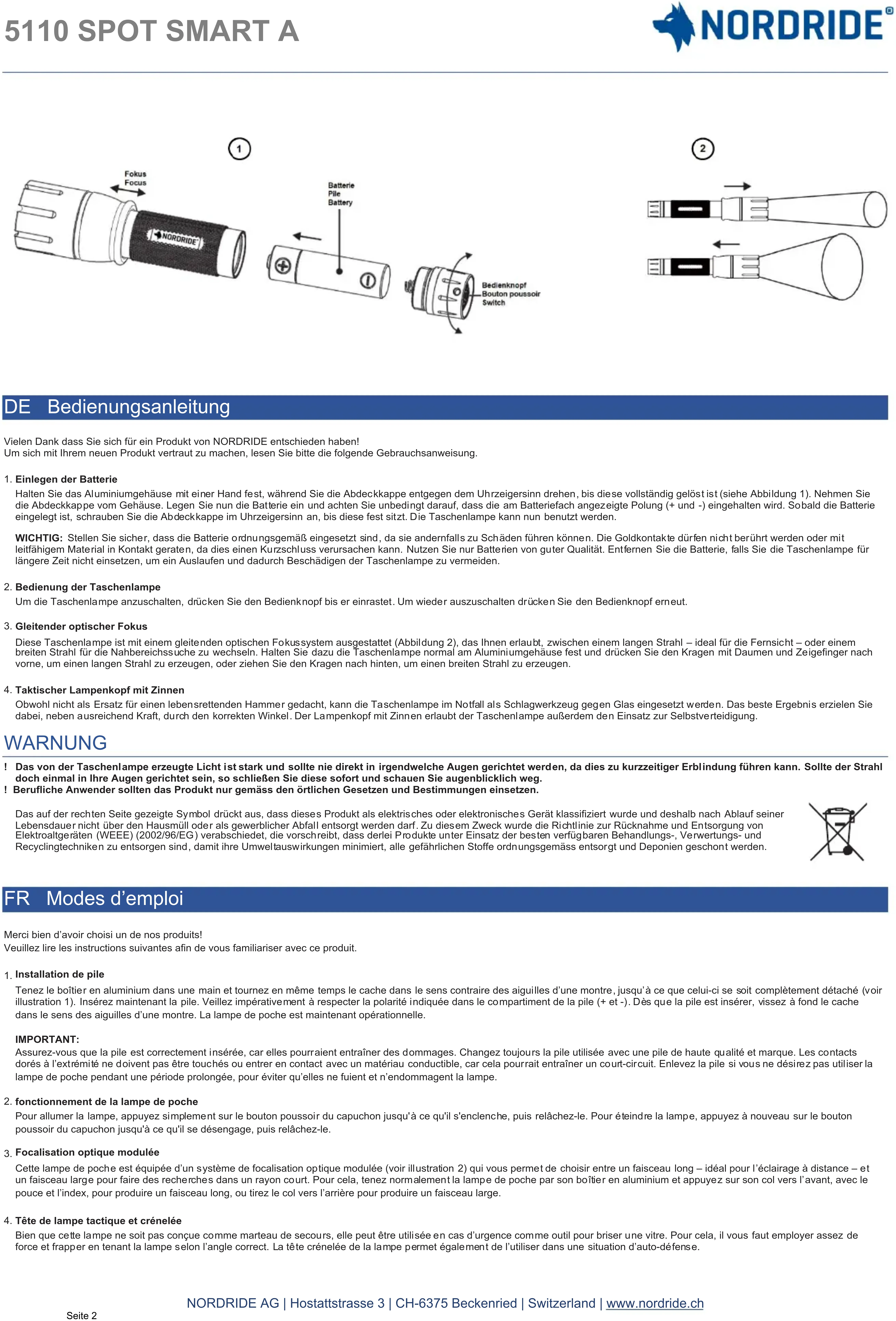 Tête de lampe tactique et crénelée Bien que cette lampe ne soit pas conçue comme marteau de secours, elle peut être utilisée en cas d’urgence comme outil pour briser une vitre. Pour cela, il vous faut employer assez de force et frapper en tenant la lampe selon l’angle correct. La tête crénelée de la lampe permet également de l’utiliser dans une situation d’auto-défense.5110 SPOT SMART A NORDRIDE AG | Hostattstrasse 3 | CH-6375 Beckenried | Switzerland | www.nordride.ch Seite 2