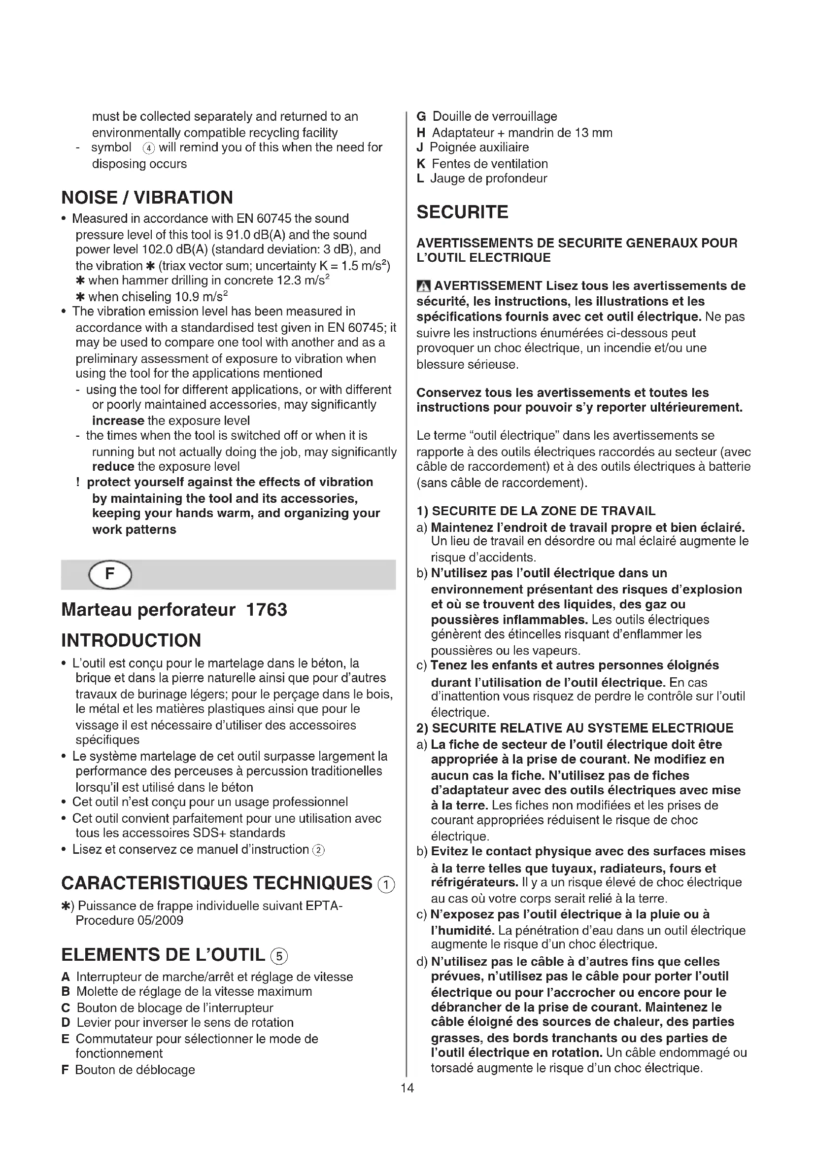 - Mesuré selon EN 60745 le niveau de la pression sonore de cet outil est 91,0 dB(A) et le niveau de la puissance sonore 102,0 dB(A) (déviation standard: 3 dB), et la vibration ✱ (somme vectorielle des trois axes directionnels; incertitude K = 1,5 m/s²) ✱ pendant le martelage au béton 12,3 m/s² ✱ pendant le burinage 10,9 m/s²
