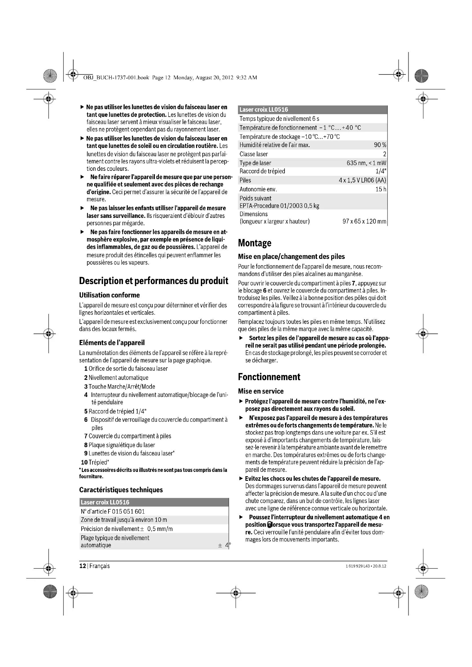 TRUCTIONS DE SECURITE. f Attention – si d’autres dispositifs d’utilisation ou d’ajus- tage que ceux indiqués ici sont utilisés ou si d’autres pro- cédés sont appliqués, ceci peut entraîner une exposition dangereuse au rayonnement. f Cet appareil de mesure est fourni avec une plaque d’aver- tissement (dans la représentation de l’appareil de mesu- re se trouvant sur la page des graphiques elle est mar- quée du numéro 8). f Avant la première mise en service, recouvrir le texte de la plaque d’avertissement par l’autocollant fourni dans vo- tre langue. f Ne pas diriger le faisceau laser vers des personnes ou des animaux et ne jamais regarder soi-même dans le faisceau laser. Cet appareil de mesure génère des rayonnements laser Classe laser 2 selon la norme IEC 60825-1. D’autres personnes peuvent être éblouies. OBJ_BUCH-1737-001.book Page 11 Monday, August 20, 2012 9:32 AM12 | Français 1 619 929 L43 • 20.8.12 f Ne pas utiliser les lunettes de vision du faisceau laser en tant que lunettes de protection. Les lunettes de vision du faisceau laser servent à mieux visualiser le faisceau laser, elles ne protègent cependant pas du rayonnement laser. f Ne pas utiliser les lunettes de vision du faisceau laser en tant que lunettes de soleil ou en circulation routière. Les lunettes de vision du faisceau laser ne protègent pas parfai- tement contre les rayons ultra-violets et réduisent la percep- tion des couleurs. f Ne faire réparer l’appareil de mesure que par une person- ne qualifiée et seulement avec des pièces de rechange d’origine. Ceci permet d’assurer la sécurité de l’appareil de mesure. f Ne pas laisser les enfants utiliser l’appareil de mesure laser sans surveillance. Ils risqueraient d’éblouir d’autres personnes par mégarde. f Ne pas faire fonctionner les appareils de mesure en at- mosphère explosive, par exemple en présence de liqui- des inflammables, de gaz ou de poussières. L’appareil de mesure produit des étincelles qui peuvent enflammer les poussières ou les vapeurs. Description et performances du produit Utilisation conforme L’appareil de mesure est conçu pour déterminer et vérifier des lignes horizontales et verticales. L’appareil de mesure est exclusivement conçu pour fonctionner dans des locaux fermés. Eléments de l’appareil La numérotation des éléments de l’appareil se réfère à la repré- sentation de l’appareil de mesure sur la page graphique. 1 Orifice de sortie du faisceau laser 2 Nivellement automatique 3 Touche Marche/Arrêt/Mode 4 Interrupteur du nivellement automatique/blocage de l’uni- té pendulaire 5 Raccord de trépied 1/4" 6 Dispositif de verrouillage du couvercle du compartiment à piles 7 Couvercle du compartiment à piles 8 Plaque signalétique du laser 9 Lunettes de vision du faisceau laser* 10 Trépied*