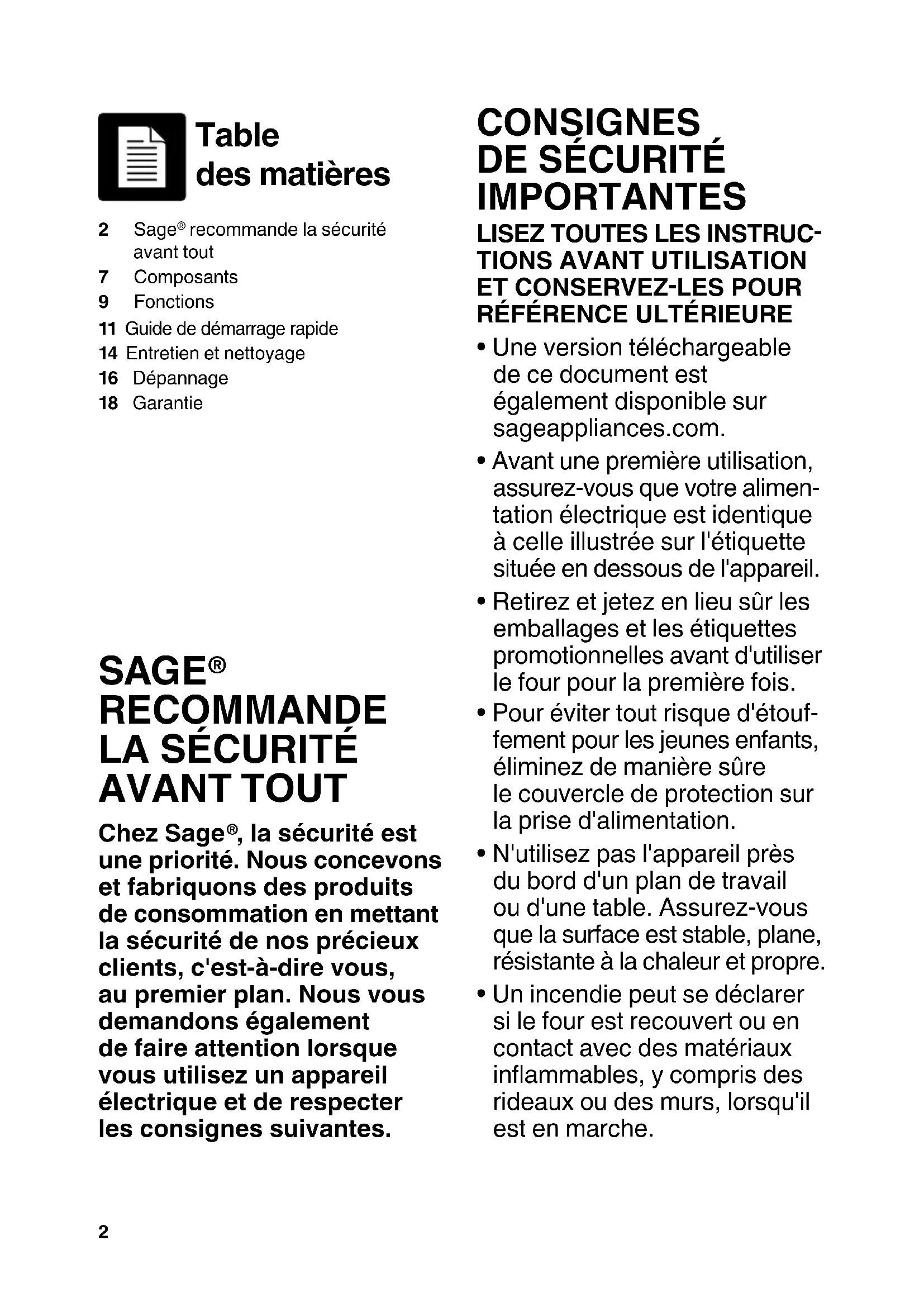 , la sécurité est une priorité. Nous concevons et fabriquons des produits de consommation en mettant la sécurité de nos précieux clients, c'est-à-dire vous, au premier plan. Nous vous demandons également de faire attention lorsque vous utilisez un appareil électrique et de respecter les consignes suivantes. 2 Sage recommande la sécurité avant tout7 Composants9 Fonctions11 Guide de démarrage rapide14 Entretien et nettoyage16 Dépannage18 Garantie3