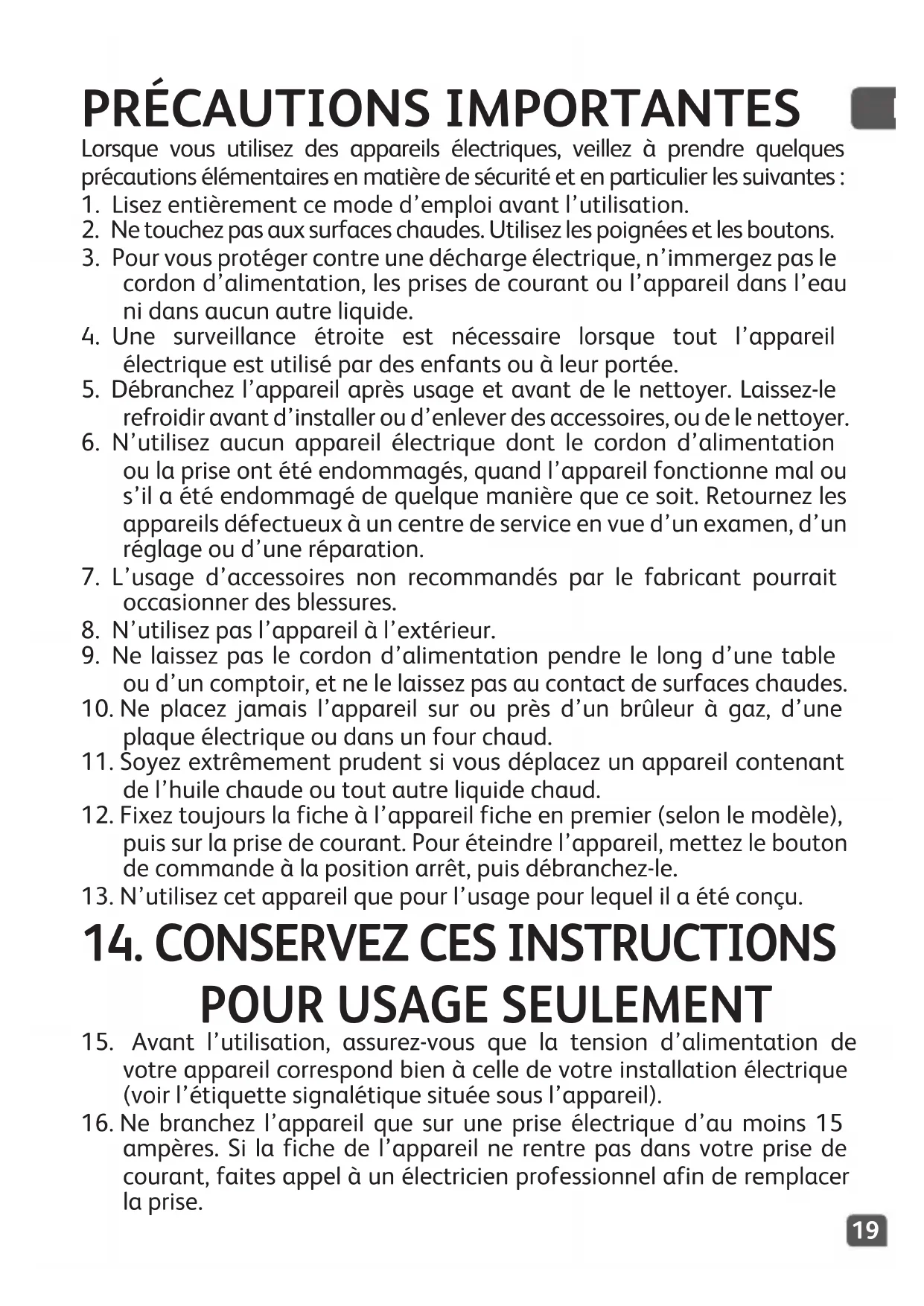 16. Ne branchez l’appareil que sur une prise électrique d’au moins 15