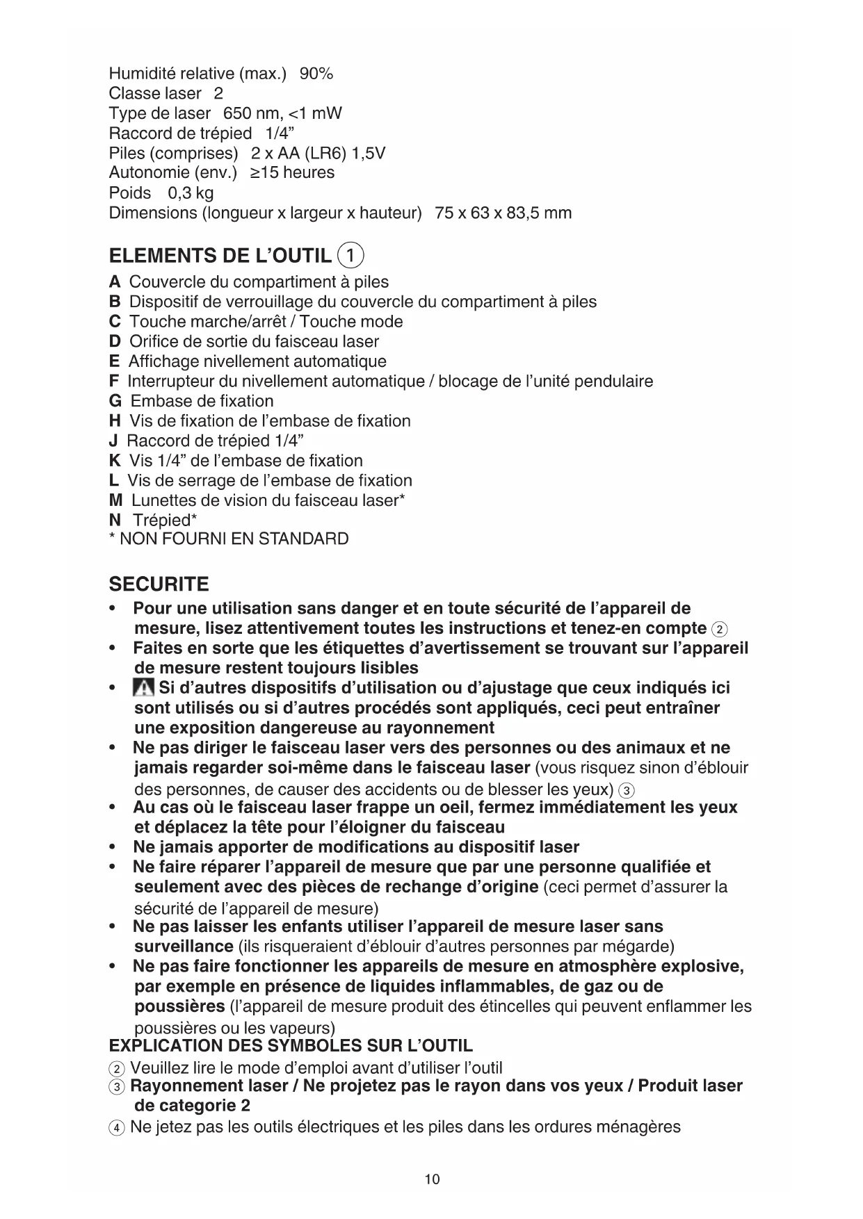2 Veuillez lire le mode d’emploi avant d’utiliser l’outil 3 Rayonnement laser / Ne projetez pas le rayon dans vos yeux / Produit laser de categorie 2 4 Ne jetez pas les outils électriques et les piles dans les ordures ménagères11 UTILISATION