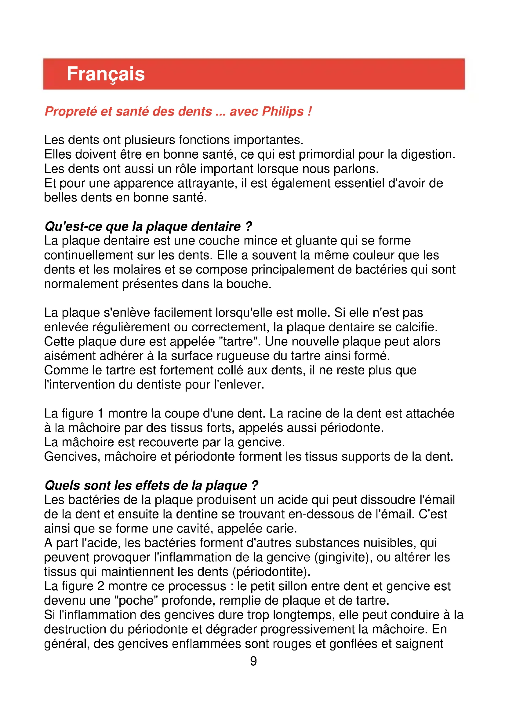 - Please note: Only unscrew the bottom for battery removal. The toothbrush may not be watertight anymore after the bottom has been unscrewed. For that reason the guarantee is void after opening the toothbrush. 7Fitting a different plug This appliance is fitted with a BS 1363 13 Amp. plug. Should you need to replace the plug, connect the wires as follows: Brown wire to the Live (L) terminal of the new plug. Blue wire to the Neutral (N) terminal of the new plug. Always fit the same value of fuse as that originally supplied with your appliance. Only use BS 1362 approved fuses. As a guide only: Appliances under 700 W can have a 3 Amp. fuse (red) and all others should have a 13 Amp. fuse (brown). When disposing of an old plug (particularly the moulded type which has been cut from the mains cord) always remove the fuse as the plug could be dangerous if ever inserted in a live socket. 8Propreté et santé des dents ... avec Philips ! Les dents ont plusieurs fonctions importantes. Elles doivent être en bonne santé, ce qui est primordial pour la digestion. Les dents ont aussi un rôle important lorsque nous parlons. Et pour une apparence attrayante, il est également essentiel d'avoir de belles dents en bonne santé. Qu'est-ce que la plaque dentaire ? La plaque dentaire est une couche mince et gluante qui se forme continuellement sur les dents. Elle a souvent la même couleur que les dents et les molaires et se compose principalement de bactéries qui sont normalement présentes dans la bouche. La plaque s'enlève facilement lorsqu'elle est molle. Si elle n'est pas enlevée régulièrement ou correctement, la plaque dentaire se calcifie. Cette plaque dure est appelée "tartre". Une nouvelle plaque peut alors aisément adhérer à la surface rugueuse du tartre ainsi formé. Comme le tartre est fortement collé aux dents, il ne reste plus que l'intervention du dentiste pour l'enlever. La figure 1 montre la coupe d'une dent. La racine de la dent est attachée à la mâchoire par des tissus forts, appelés aussi périodonte. La mâchoire est recouverte par la gencive. Gencives, mâchoire et périodonte forment les tissus supports de la dent. Quels sont les effets de la plaque ? Les bactéries de la plaque produisent un acide qui peut dissoudre l'émail de la dent et ensuite la dentine se trouvant en-dessous de l'émail. C'est ainsi que se forme une cavité, appelée carie. A part l'acide, les bactéries forment d'autres substances nuisibles, qui peuvent provoquer l'inflammation de la gencive (gingivite), ou altérer les tissus qui maintiennent les dents (périodontite). La figure 2 montre ce processus : le petit sillon entre dent et gencive est devenu une "poche" profonde, remplie de plaque et de tartre. Si l'inflammation des gencives dure trop longtemps, elle peut conduire à la destruction du périodonte et dégrader progressivement la mâchoire. En général, des gencives enflammées sont rouges et gonflées et saignent Français 9souvent lorsque vous vous brossez les dents. La poche devenant plus profonde, la plaque et le tartre commencent à s'y développer. Finalement, cela mène au déchaussement, voire à la perte d'une ou plusieurs dents (fig. 3). En enlevant minutieusement la plaque dentaire, vous pourrez prévenir la gingivite et stopper le développement de périodontite. Brosses à dents rechargeables HP 405 et HP 355 Mouvement des brosses "Clean & Clear" (fig. 4a) Les poils de la brosse ont un mouvement dans deux sens et à deux vitesses différentes :