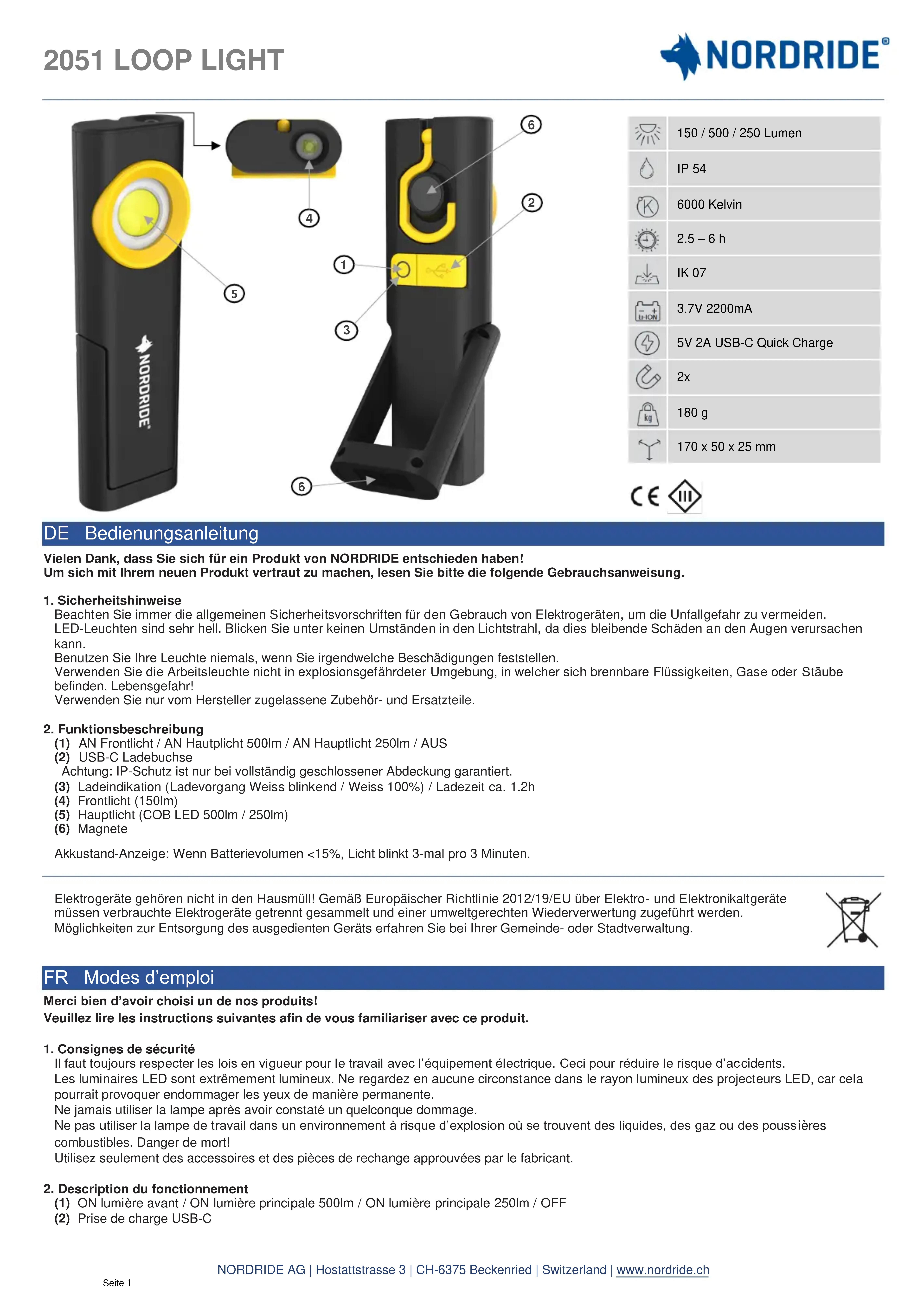 52051 LOOP LIGHT NORDRIDE AG | Hostattstrasse 3 | CH-6375 Beckenried | Switzerland | www.nordride.ch Seite 2 Attention : la protection IP n'est garantie que lorsque le couvercle est complètement fermé. (3) Indication de charge (processus de charge blanc clignotant / blanc 100%) (4) Lumière avant (150lm) (5) Lumière principale (COB LED 500lm / 250lm) / Temps de charge environ 1.2h (6) Aimants Indication du niveau de batterie: si le volume de la batterie est <15%, le voyant clignote 3 fois toutes les 3 minutes.