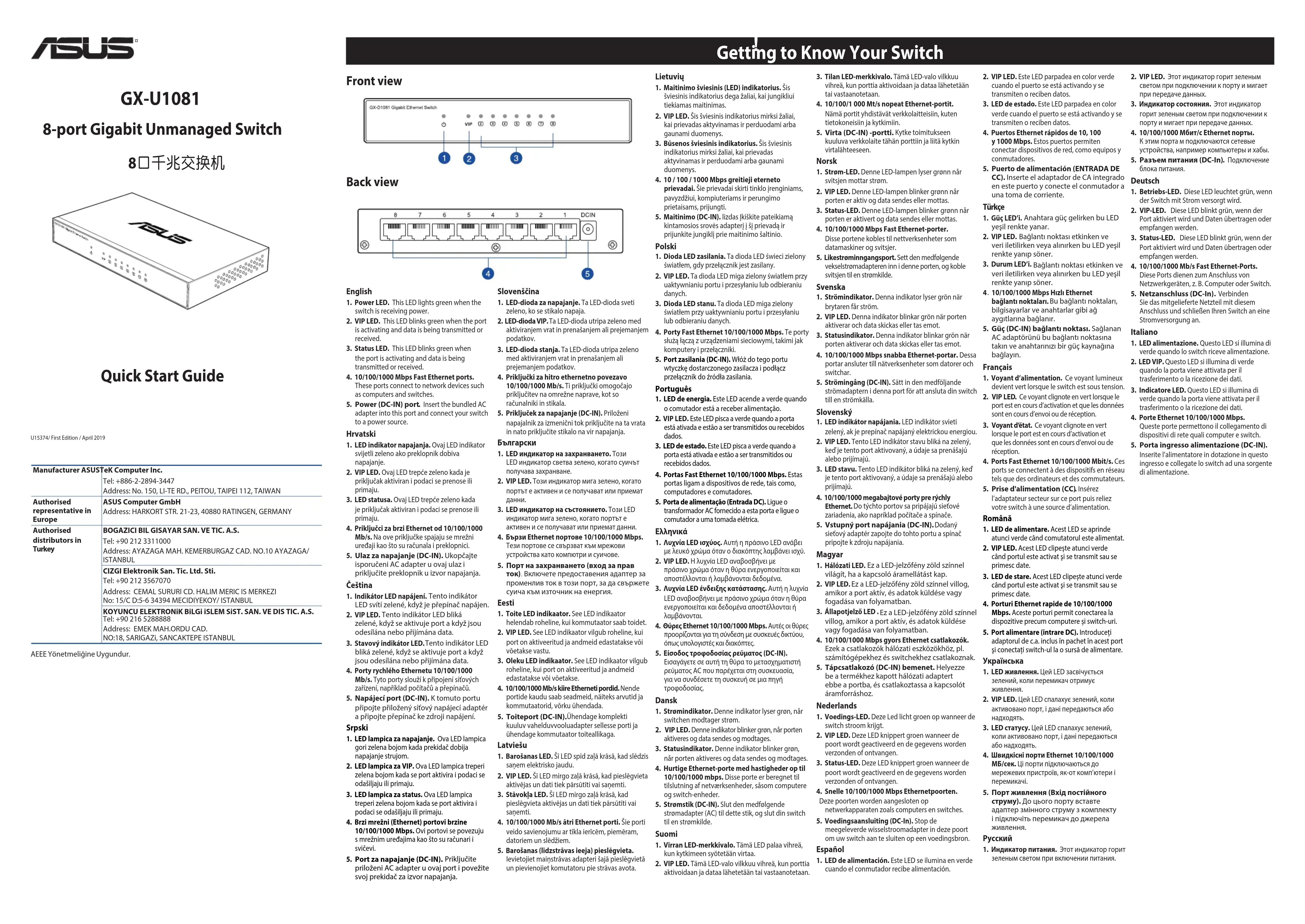 lorsque le port est en cours d’activation et que les données sont en cours d’envoi ou de réception.4. Ports Fast Ethernet 10/100/1000 Mbit/s. Ces ports se connectent à des dispositifs en réseau tels que des ordinateurs et des commutateurs. Prise d'alimentation (CC). Insérez l’adaptateur secteur sur ce port puis reliez votre switch à une source d’alimentation. Română 1. LED de alimentare. Acest LED se aprinde atunci verde când comutatorul este alimentat.2. VIP LED. Acest LED clipește atunci verde când portul este activat şi se transmit sau se primesc date.3. LED de stare. Acest LED clipește atunci verde când portul este activat şi se transmit sau se primesc date.4. Porturi Ethernet rapide de 10/100/1000 Mbps. Aceste porturi permit conectarea la dispozitive precum computere și switch-uri.5. Port alimentare (intrare DC). Introduceți adaptorul de c.a. inclus în pachet în acest port şi conectați switch-ul la o sursă de alimentare. 1. LED живлення. Цей LED засвічується зелений, коли перемикач отримує живлення.2. VIP LED. Цей LED спалахує зелений, коли активовано порт, і дані передаються або надходять.3. LED статусу. Цей LED спалахує зелений, коли активовано порт, і дані передаються або надходять.4. Швидкісні порти Ethernet 10/100/1000 МБ/сек. Ці порти підключаються до мережевих пристроїв, як-от комп’ютери і перемикачі. Порт живлення (Вхід постійного струму). До цього порту вставте адаптер змінного струму з комплекту і підключіть перемикач до джерела живлення. Pyccкий 1. Индикатор питания. Этот индикатор горит зеленым светом при включении питания.2. VIP LED. Этот индикатор горит зеленым светом при подключении к порту и мигает при передаче данных.3. Индикатор состояния. Этот индикатор горит зеленым светом при подключении к порту и мигает при передаче данных. 4. 10/100/1000 Mбит/с Ethernet порты. К этим порта м подключаются сетевые устройства, например компьютеры и хабы. Разъем питания (DC-In). Подключение блока питания. Deutsch 1. Betriebs-LED. Diese LED leuchtet grün, wenn der Switch mit Strom versorgt wird.2. VIP-LED. Diese LED blinkt grün, wenn der Port aktiviert wird und Daten übertragen oder empfangen werden.3. Status-LED. Diese LED blinkt grün, wenn der Port aktiviert wird und Daten übertragen oder empfangen werden. 4. 10/100/1000 Mb/s Fast Ethernet-Ports. Diese Ports dienen zum Anschluss von Netzwerkgeräten, z. B. Computer oder Switch. Netzanschluss (DC-In). Verbinden Sie das mitgelieferte Netzteil mit diesem Anschluss und schließen Ihren Switch an eine Stromversorgung an. Italiano 1. LED alimentazione. Questo LED si illumina di verde quando lo switch riceve alimentazione.2. LED VIP. Questo LED si illumina di verde quando la porta viene attivata per il trasferimento o la ricezione dei dati.3. Indicatore LED. Questo LED si illumina di verde quando la porta viene attivata per il trasferimento o la ricezione dei dati. 4. Porte Ethernet 10/100/1000 Mbps. Queste porte permettono il collegamento di dispositivi di rete quali computer e switch. Porta ingresso alimentazione (DC-IN). Inserite l’alimentatore in dotazione in questo ingresso e collegate lo switch ad una sorgente di alimentazione. Front view Back viewNotebook PCRouter NAS RJ-45 RJ-45RJ-45 ASUSTeK COMPUTER INC. (Asia Pacic) Address 15 Li-Te Road, Peitou, Taipei, Taiwan 11259 Website www.asus.com.tw Technical Support Telephone +886228943447 Support Fax +886228907698 Online support https://www.asus.com/support/ ASUS COMPUTER INTERNATIONAL (America) Address 48720 Kato Rd., Fremont, CA 94538, USA Telephone +15107393777 Fax +15106084555 Website usa.asus.com Online support https://www.asus.com/support/ ASUS COMPUTER GmbH (Germany and Austria) Address Harkort Str. 21-23, D-40880 Ratingen, Germany Support Fax +49-2102-959931 Website asus.com/de Online contact eu-rma.asus.com/sales Technical Support Telephone (Component) +49-2102-5789555 Telephone Germany (System/Notebook/Eee/LCD) +49-2102-5789557 Telephone Austria (System/Notebook/Eee/LCD) +43-820-240513 Support Fax +49-2102-959911 Online support https://www.asus.com/support/ English CE statement Simplied EU Declaration of Conformity ASUSTek Computer Inc. hereby declares that this device is in compliance with the essential requirements and other relevant provisions of Directive 2014/53/EU. Full text of EU declaration of conformity is available at https://www.asus.com/support. Hrvatski CE izjava Pojednostavljena EU Izjava o sukladnosti ASUSTek Computer Inc. ovime izjavljuje da je uređaj sukladan s osnovnim zahtjevima i ostalim važnim odredbama direktive 2014/53/EU. Cijeli tekst EU izjave o sukladnosti dostupan je na https://www.asus.com/support/. Čeština Prohlášení CE Forenklet EU- overensstemmelseserklæringen ASUSTek Computer Inc. erklærer herved, at denne enhed er i overensstemmelse med hovedkravene og øvrige relevante bestemmelser i direktiv 2014/53/EU. Hele EU-overensstemmelseserklæringen kan ndes på https://www.asus.com/support/. Slovenščina Izjava CE Poenostavljena izjava o skladnosti EU ASUSTek Computer Inc. izjavlja, da je ta naprava skladna s temeljnimi zahtevami in drugimi relevantnimi določili Direktive 2014/53/EU. Celotno besedilo izjave EU o skladnosti je na voljo na spletnem mestu https://www.asus.com