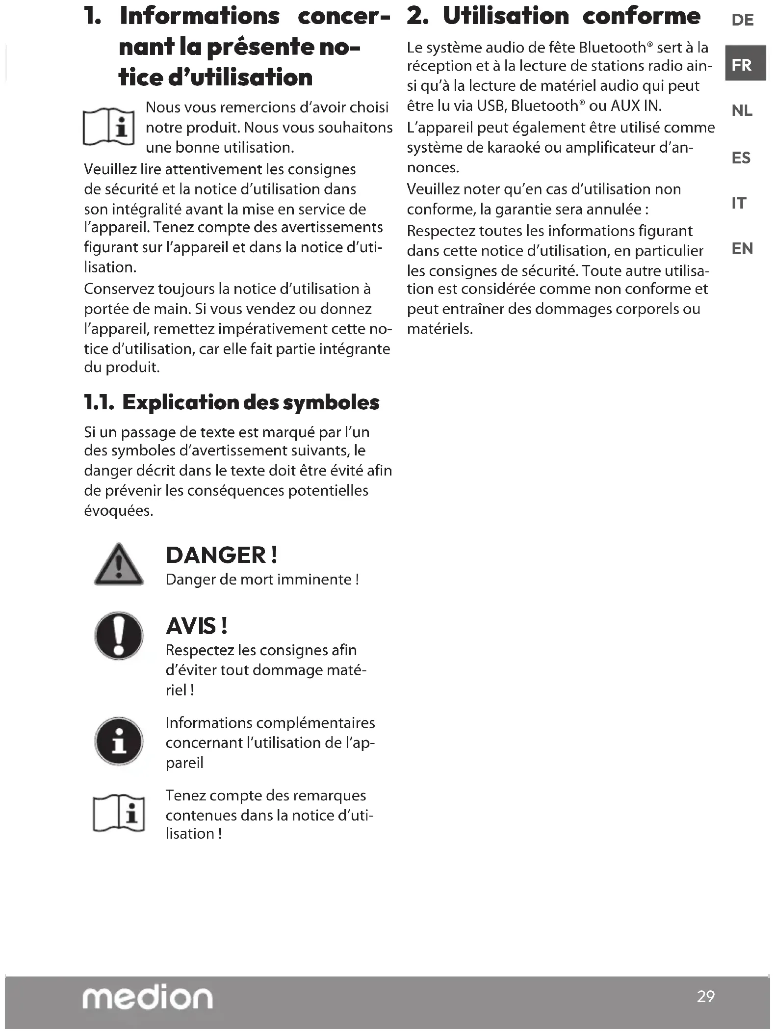 nant la présente no- tice d’utilisation Nous vous remercions d’avoir choisi notre produit. Nous vous souhaitons une bonne utilisation. Veuillez lire attentivement les consignes de sécurité et la notice d’utilisation dans son intégralité avant la mise en service de l’appareil. Tenez compte des avertissements figurant sur l’appareil et dans la notice d’uti- lisation. Conservez toujours la notice d’utilisation à portée de main. Si vous vendez ou donnez l’appareil, remettez impérativement cette no- tice d’utilisation, car elle fait partie intégrante du produit. 1.1. Explication des symboles Si un passage de texte est marqué par l’un des symboles d’avertissement suivants, le danger décrit dans le texte doit être évité afin de prévenir les conséquences potentielles évoquées. DANGER! Danger de mort imminente! AV IS ! Respectez les consignes afin d’éviter tout dommage maté- riel! Informations complémentaires concernant l’utilisation de l’ap- pareil Tenez compte des remarques contenues dans la notice d’uti- lisation!