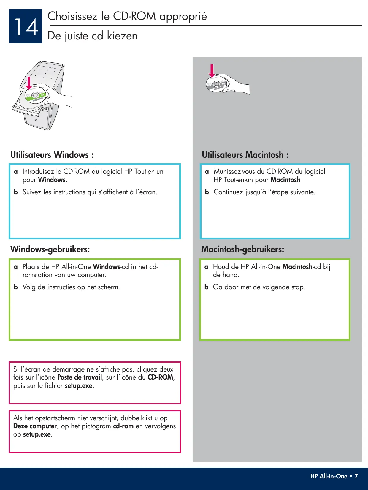 Choisissez le CD-ROM approprié De juiste cd kiezen Utilisateurs Windows : Utilisateurs Macintosh : a Introduisez le CD-ROM du logiciel HP Tout-en-un pour Windows. a Munissez-vous du CD-ROM du logiciel HP Tout-en-un pour Macintosh b Suivez les instructions qui s’affichent à l’écran. b Continuez jusqu’à l’étape suivante. Windows-gebruikers: Macintosh-gebruikers: a Plaats de HP All-in-One Windows-cd in het cdromstation van uw computer. a Houd de HP All-in-One Macintosh-cd bij de hand. b Volg de instructies op het scherm. b Ga door met de volgende stap. Si l’écran de démarrage ne s’affiche pas, cliquez deux fois sur l’icône Poste de travail, sur l’icône du CD-ROM, puis sur le fichier setup.exe. Als het opstartscherm niet verschijnt, dubbelklikt u op Deze computer, op het pictogram cd-rom en vervolgens op setup.exe. HP All-in-One • 7