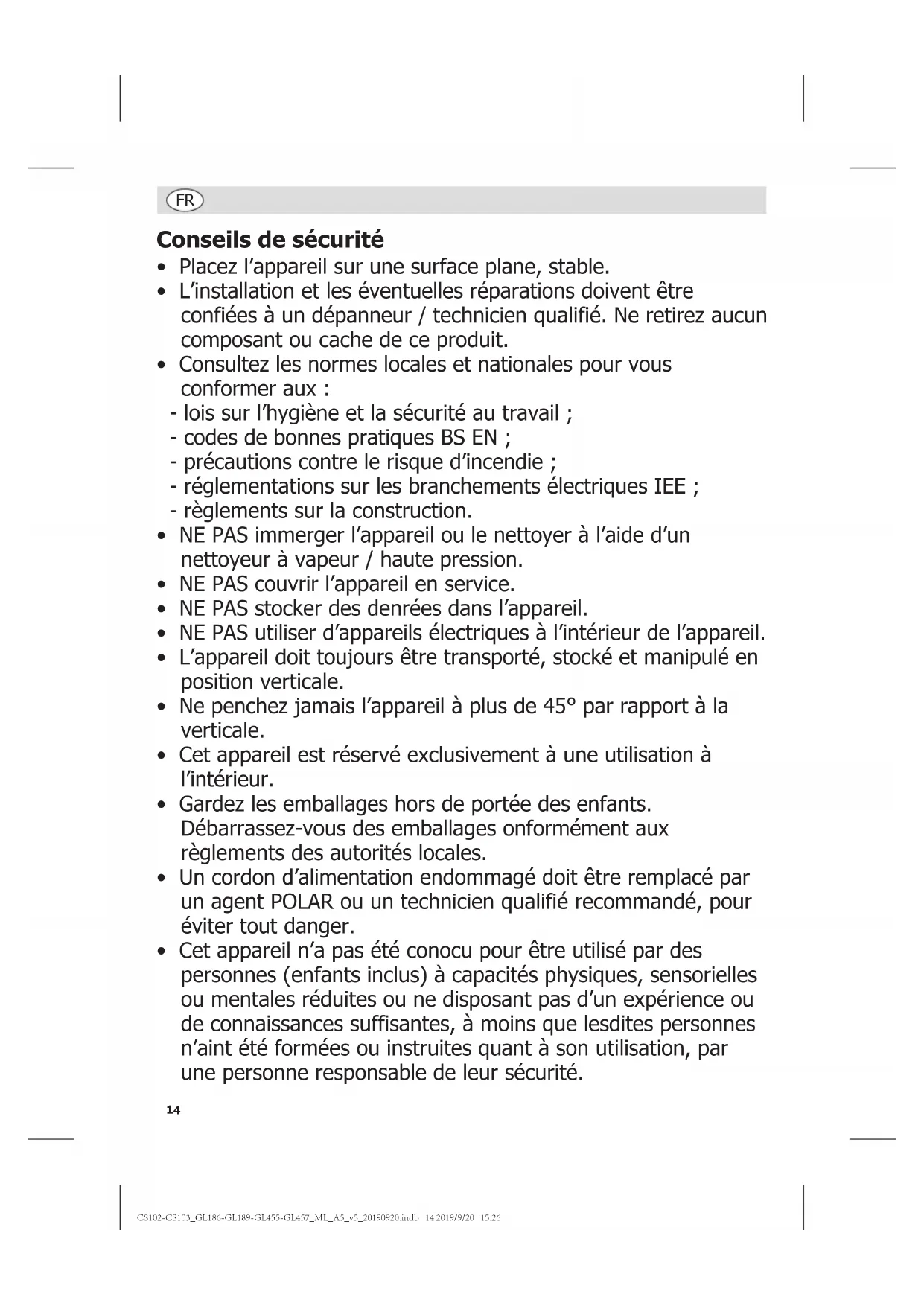 - Fil de terre (vert / jaune) à la borne marquée E Cet appareil doit être mis à la terre. En cas de doute, consultez un électricien qualifié. Les points d’isolation électrique doivent être libres de toute obstruction. En cas de débranchement requis en urgence, ils doivent être facilement accessibles. Mise au rebut Les règlements de l’UE exigent que les produits munis de réfrigérants soient mis au rebut par des entreprises spécialisées, équipées pour extraire et recycler les composants à gaz, métalliques et en plastique. Adressez-vous à votre autorité chargée de la collecte des déchets pour ce qui concerne la mise au rebut de votre appareil. Même si rien n’oblige les autorités locales à se charger de la mise au rebut du matériel de réfrigération commerciale, elles pourraient être en mesure de vous conseiller sur les moyens disponibles localement pour s’en débarrasser. Vous pouvez aussi appeler le standard d’assistance POLAR, qui saura vous renseigner sur les entreprises de prise en charge nationales au sein de l’UE. Conformité Le logo WEEE qui figure sur ce produit ou sa documentation indique qu'il ne doit pas être mis au rebut avec les ordures ménagères. Pour éviter qu'il ne présente un risque pour la santé humaine et / ou écologique, confiez la mise au rebut de ce produit à un site de recyclage agréé respectueux de l'environnement. Pour de plus amples détails sur la mise au rebut appropriée de ce produit, contactez le fournisseur du produit ou l'autorité responsable de l'enlèvement des ordures dans votre région. Les pièces POLAR ont été soumises à des tests rigoureux pour pouvoir être déclarées conformes aux normes et spécifications réglementaires définies par les autorités internationales, indépendantes et fédérales. Les produits POLAR ont été déclarés aptes à porter le symbole suivant : Tous droits réservés. La production ou transmission, partielles ou intégrales, sous quelque forme que ce soit ou par n’importe quel moyen, tant électronique que mécanique, sous forme de photocopie, d’enregistrement ou autre de ce mode d’emploi sont interdites sans l’autorisation préalablement accordée par POLAR. Nous nous efforçons, par tous les moyens dont nous disposons, de faire en sorte que les détails contenus dans le présent mode d’emploi soient corrects en date d’impression. Toutefois, POLAR se réserve le droit de changer les spécifications de ses produits sans préavis. CS102-CS103_GL186-GL189-GL455-GL457_ML_A5_v5_20190920.indb 19 2019/9/20 15:2620