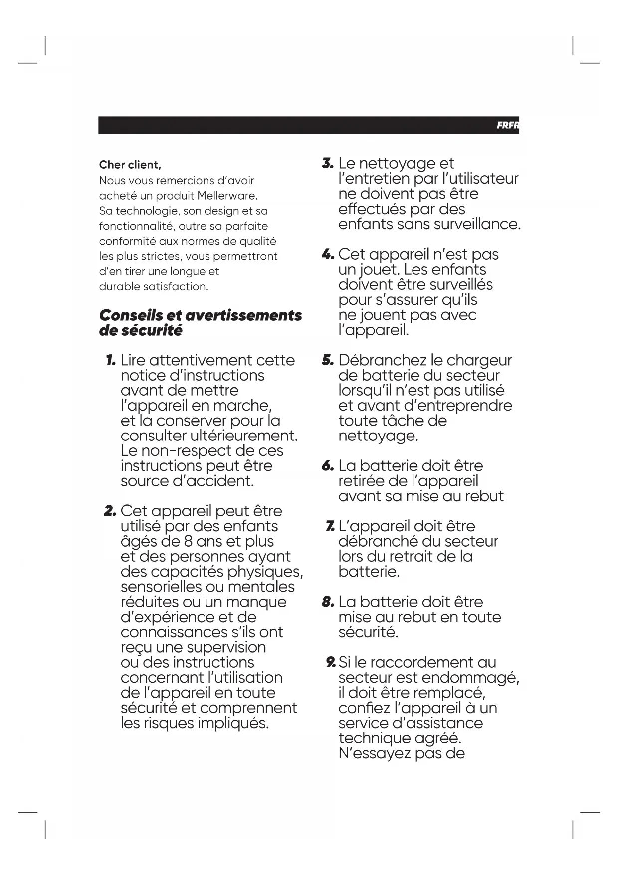 DE L’INTÉRIEUR DE L’APPAREIL ATTENTION: Il est important que les batteries soient complètement déchargées avant de les retirer de l’appareil. ATTENTION: l’appareil doit être débranché du secteur lors du retrait des piles. Pour retirer les piles, une fois la durée de vie de l’appareil terminée, procédez comme suit: Ouvrez le boîtier inférieur de l’appareil en retirant au préalable les vis de xation à l’aide d’un tournevis. Cet appareil est certi é conforme à la Directive 2014/35/EU de Basse Tension, de même qu’à la Directive 2014/30/EU en matière de Compatibilité Électromagnétique, à la Directive 2011/65/EU relative à la limitation d’utilisation de certaines substances dangereuses dans les équipements électriques et électroniques et à la Directive 2009/125/EC sur les conditions de conception écologique applicables aux produits faisant usage d’énergie. Garantie et assistance technique Ce produit est reconnu et protégé par la garantie établie conformément à la législation en vigueur. Pour faire valoir vos droits ou intérêts, vous devrez vous adresser à l’un de nos services d’assistance technique agréés. Pour savoir lequel est le plus proche, vous pouvez accéder au lien suivant: www.mellerware.com Vous pouvez également demander des informations connexes en nous contactant au numéro de téléphone gurant à la n de ce manuel. Vous pouvez télécharger cette notice d’instructions et ses mises à jour sur www.mellerware.com