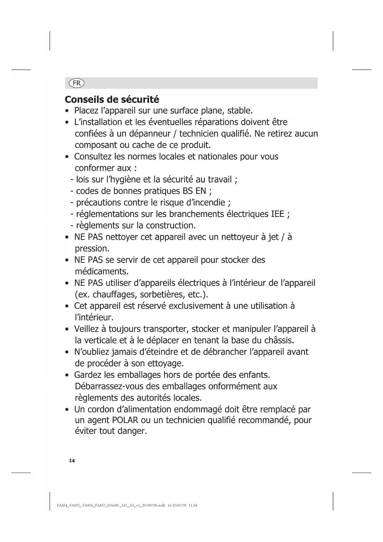 - Un cordon d’alimentation endommagé doit être remplacé par un agent POLAR ou un technicien qualifié recommandé, pour éviter tout danger. FA854_FA855_ FA856_FA857_DA680 _ML_A5_v1_20190708.indb 14 2019/7/8 11:5815