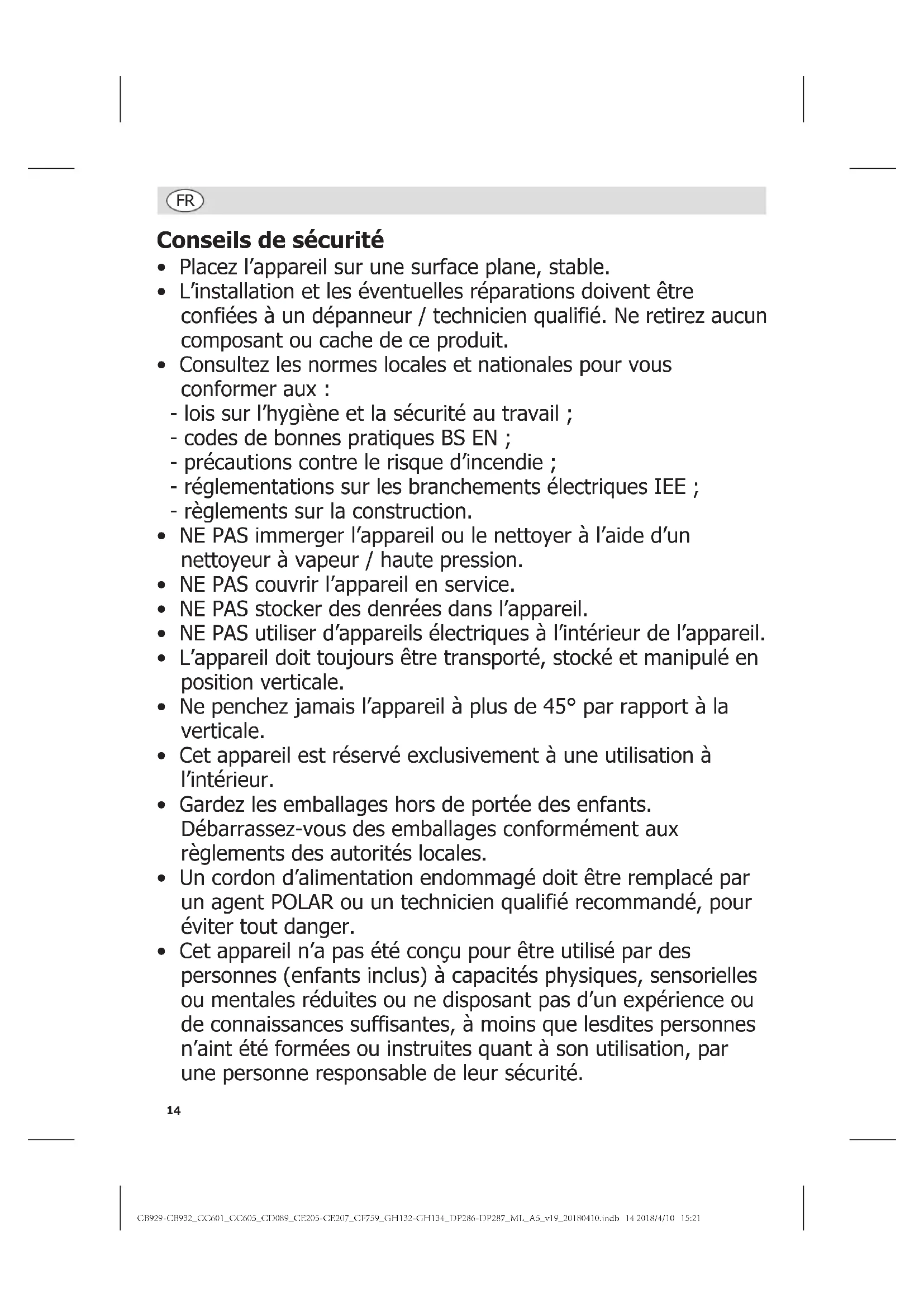 Dysfonctionnement Cause probable Intervention L’appareil s’allume, mais la température est trop haute / basse L’appareil est situé près d’une source de chaleur ou l’air ne circule pas librement vers le condensateur Placer l’appareil à un endroit plus propice à son bon fonctionnement Température ambiante trop haute Augmenter la ventilation ou placer l’appareil à un endroit plus frais Ailettes insuffisamment ventilées Débarrasser les ailettes d’éventuelles obstructions L’appareil est surchargé Réduire la quantité d’aliments stockés dans l’appareil Paramètres d’usine par défaut ajustés Appeler un agent POLAR ou un technicien qualifié L’appareil fait beaucoup de bruit L’appareil est en contact avec un objet placé à proximité Vérifier l’emplacement et déplacer l’appareil si nécessaire La surface sur laquelle l’appareil a été posé n’est pas de niveau ou l’appareil n’est pas stable Vérifier l’emplacement et déplacer l’appareil si nécessaire Spécifications techniques Modèle Tension Puissance Courant Plage de température Capacité (litres) Réfrigérant Dimensions h x l x p mm Poids (kg) CB929 230V 50Hz 105,4W 1,1A 2°C - 8°C 140 R600a 40g 925 x 600 x 540 54 CB930 230V 50Hz 112W 1,1A 2°C - 8°C 223 R600a 55g 925 x 920 x 540 75 CB931 230V 50Hz 112W 1,1A 2°C - 8°C 223 R600a 55g 925 x 920 x 535 72 CB932 230V 50Hz 137,6W 1,1A 2°C - 8°C 335 R600a 40g 925 x 1350 x 540 95 CC601 230V 50Hz 112W 1,1A 2°C - 8°C 223 R600a 55g 925 x 920 x 535 95 CC605 230V 50Hz 137,6W 1,1A 2°C - 8°C 335 R600a 40g 925 x 1350 x 535 91 CD089 230V 50Hz 105,4W 1,1A 2°C - 8°C 140 R600a 40g 925 x 600 x 535 54 CE205 230V 50Hz 105,4W 1,1A 2°C - 8°C 140 R600a 40g 925 x 600 x 540 54 CE206 230V 50Hz 112W 1,1A 2°C - 8°C 223 R600a 55g 925 x 920 x 540 75 CE207 230V 50Hz 137,6W 1,5A 2°C - 8°C 335 R600a 40g 925 x 1350 x 540 95 CF759 230V 50Hz 112W 1,1A 2°C - 8°C 223 R600a 55g 870 x 920 x 535 62 GH132 230V 50Hz 105,4W 1,1A 2°C - 8°C 140 R600a 40g 925 x 600 x 540 54 GH133 230V 50Hz 112W 1,1A 2°C - 8°C 223 R600a 55g 925 x 920 x 540 75 GH134 230V 50Hz 137,6W 1,1A 2°C - 8°C 335 R600a 40g 925 x 1350 x 540 95 DP286 230V 50Hz 105,4W 1,1A 2°C - 8°C 140 R600a 40g 870 x 600 x 540 54 DP287 230V 50Hz 112W 1,1A 2°C - 8°C 223 R600a 55g 870 x 920 x 540 75 CB929-CB932_CC601_CC605_CD089_CE205-CE207_CF759_GH132-GH134_DP286-DP287_ML_A5_v19_20180410.indb 18 2018/4/10 15:2119