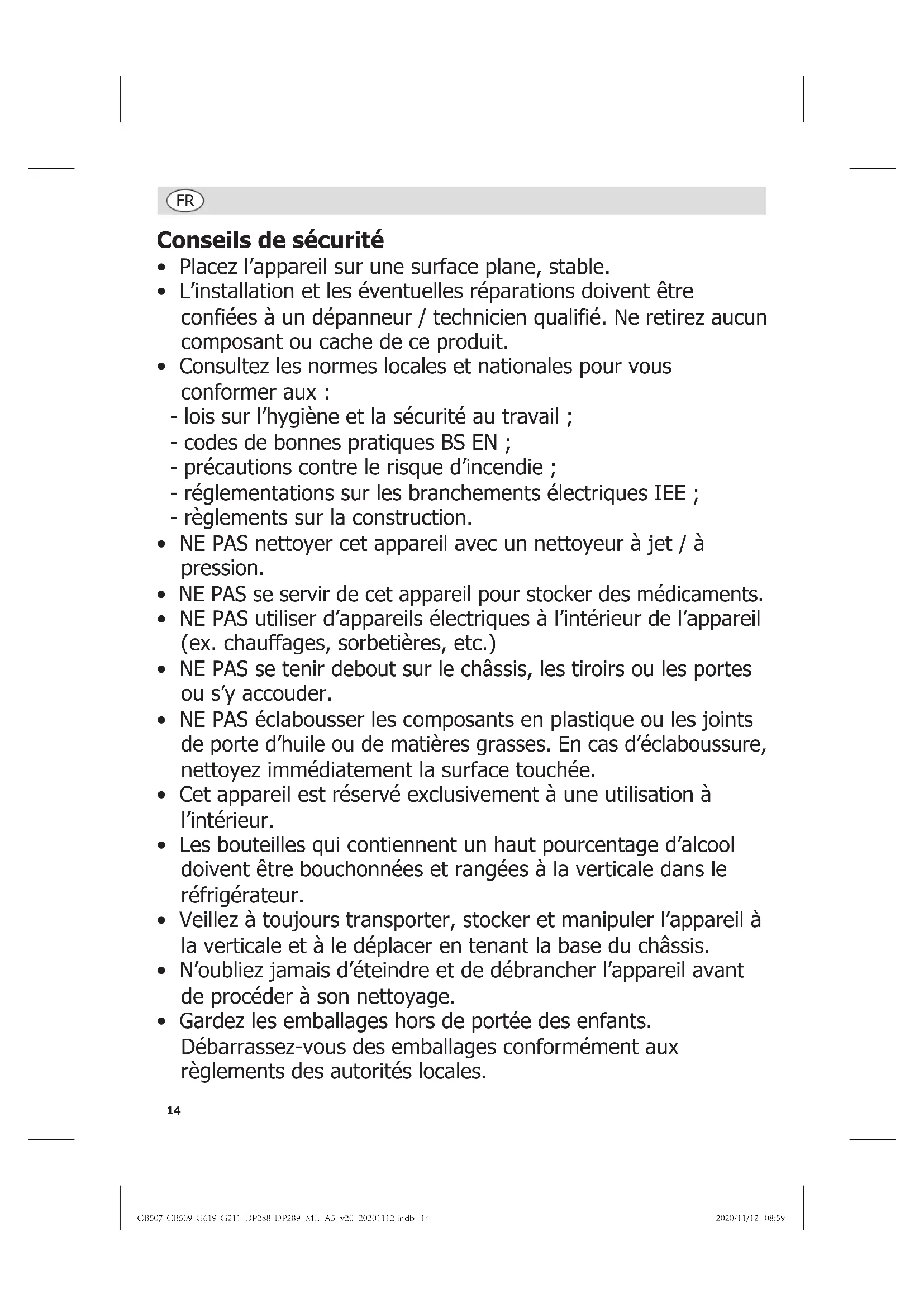 - Fil de terre (vert / jaune) à la borne marquée E Cet appareil doit être mis à la terre. En cas de doute, consultez un électricien qualifié. Les points d’isolation électrique doivent être libres de toute obstruction. En cas de débranchement requis en urgence, ils doivent être facilement accessibles. Mise au rebut Les règlements de l’UE exigent que les produits munis de réfrigérants soient mis au rebut par des entreprises spécialisées, équipées pour extraire et recycler les composants à gaz, métalliques et en plastique. Adressez-vous à votre autorité chargée de la collecte des déchets pour ce qui concerne la mise au rebut de votre appareil. Même si rien n’oblige les autorités locales à se charger de la mise au rebut du matériel de réfrigération commerciale, elles pourraient être en mesure de vous conseiller sur les moyens disponibles localement pour s’en débarrasser. Vous pouvez aussi appeler le standard d’assistance POLAR, qui saura vous renseigner sur les entreprises de prise en charge nationales au sein de l’UE. Conformité Le logo WEEE qui figure sur ce produit ou sa documentation indique qu'il ne doit pas être mis au rebut avec les ordures ménagères. Pour éviter qu'il ne présente un risque pour la santé humaine et / ou écologique, confiez la mise au rebut de ce produit à un site de recyclage agréé respectueux de l'environnement. Pour de plus amples détails sur la mise au rebut appropriée de ce produit, contactez le fournisseur du produit ou l'autorité responsable de l'enlèvement des ordures dans votre région. Les pièces POLAR ont été soumises à des tests rigoureux pour pouvoir être déclarées conformes aux normes et spécifications réglementaires définies par les autorités internationales, indépendantes et fédérales. Les produits POLAR ont été déclarés aptes à porter le symbole suivant : Tous droits réservés. La production ou transmission, partielles ou intégrales, sous quelque forme que ce soit ou par n’importe quel moyen, tant électronique que mécanique, sous forme de photocopie, d’enregistrement ou autre de ce mode d’emploi sont interdites sans l’autorisation préalablement accordée par POLAR. Nous nous efforçons, par tous les moyens dont nous disposons, de faire en sorte que les détails contenus dans le présent mode d’emploi soient corrects en date d’impression. Toutefois, POLAR se réserve le droit de changer les spécifications de ses produits sans préavis. CB507-CB509-G619-G211-DP288-DP289_ML_A5_v20_20201112.indb 19CB507-CB509-G619-G211-DP288-DP289_ML_A5_v20_20201112.indb 19 2020/11/12 08:592020/11/12 08:5920
