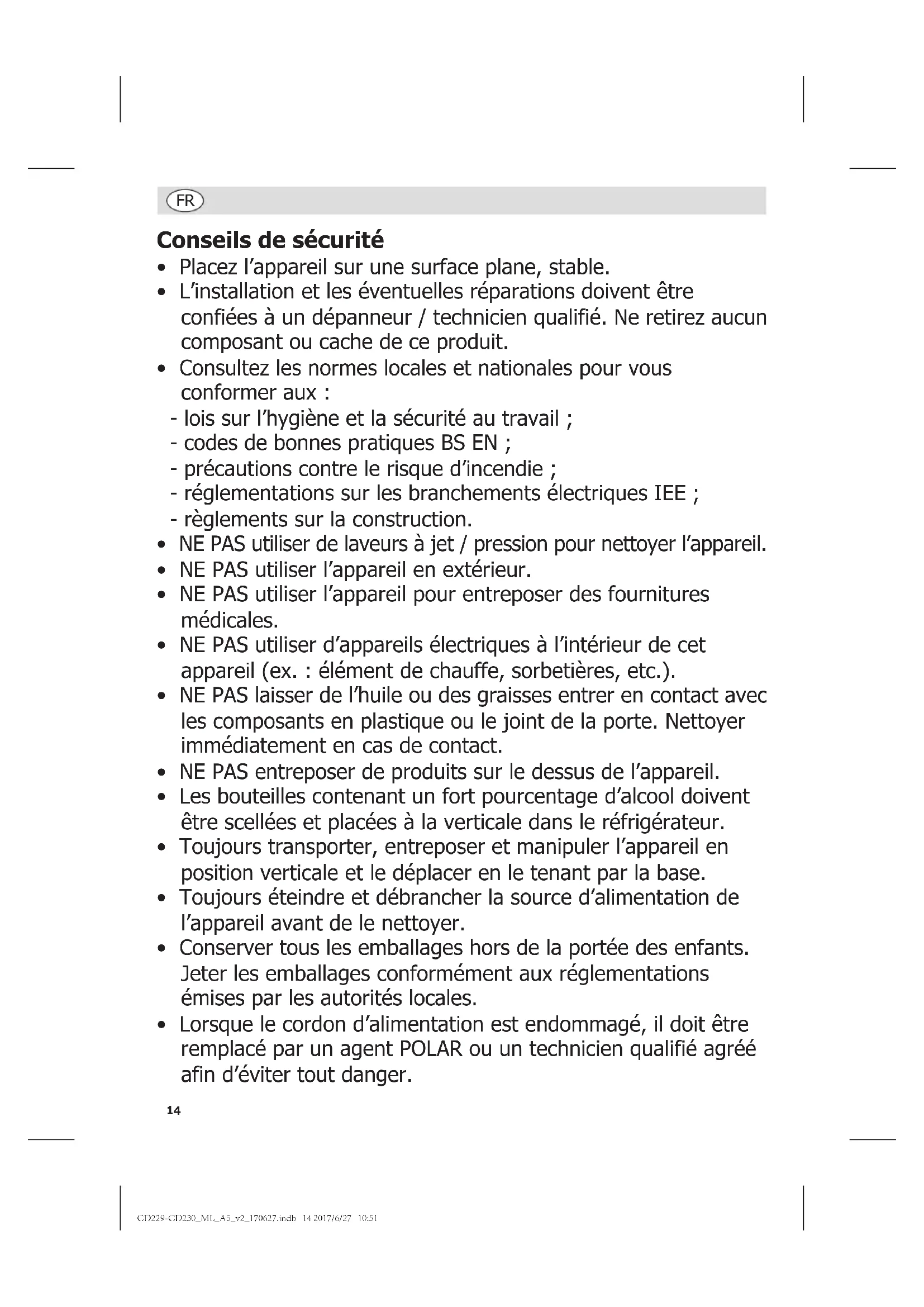 - Fil de terre (vert / jaune) à la borne marquée E Cet appareil doit être mis à la terre. En cas de doute, consultez un électricien qualifié. Les points d’isolation électrique doivent être libres de toute obstruction. En cas de débranchement requis en urgence, ils doivent être facilement accessibles. Mise au rebut Les règlements de l’UE exigent que les produits munis de réfrigérants soient mis au rebut par des entreprises spécialisées, équipées pour extraire et recycler les composants à gaz, métalliques et en plastique. Adressez-vous à votre autorité chargée de la collecte des déchets pour ce qui concerne la mise au rebut de votre appareil. Même si rien n’oblige les autorités locales à se charger de la mise au rebut du matériel de réfrigération commerciale, elles pourraient être en mesure de vous conseiller sur les moyens disponibles localement pour s’en débarrasser. Vous pouvez aussi appeler le standard d’assistance POLAR, qui saura vous renseigner sur les entreprises de prise en charge nationales au sein de l’UE. Conformité Le logo WEEE qui figure sur ce produit ou sa documentation indique qu'il ne doit pas être mis au rebut avec les ordures ménagères. Pour éviter qu'il ne présente un risque pour la santé humaine et / ou écologique, confiez la mise au rebut de ce produit à un site de recyclage agréé respectueux de l'environnement. Pour de plus amples détails sur la mise au rebut appropriée de ce produit, contactez le fournisseur du produit ou l'autorité responsable de l'enlèvement des ordures dans votre région. Les pièces POLAR ont été soumises à des tests rigoureux pour pouvoir être déclarées conformes aux normes et spécifications réglementaires définies par les autorités internationales, indépendantes et fédérales. Les produits POLAR ont été déclarés aptes à porter le symbole suivant : Tous droits réservés. La production ou transmission, partielles ou intégrales, sous quelque forme que ce soit ou par n’importe quel moyen, tant électronique que mécanique, sous forme de photocopie, d’enregistrement ou autre de ce mode d’emploi sont interdites sans l’autorisation préalablement accordée par POLAR. Nous nous efforçons, par tous les moyens dont nous disposons, de faire en sorte que les détails contenus dans le présent mode d’emploi soient corrects en date d’impression. Toutefois, POLAR se réserve le droit de changer les spécifications de ses produits sans préavis. CD229-CD230_ML_A5_v2_170627.indb 19 2017/6/27 10:5120
