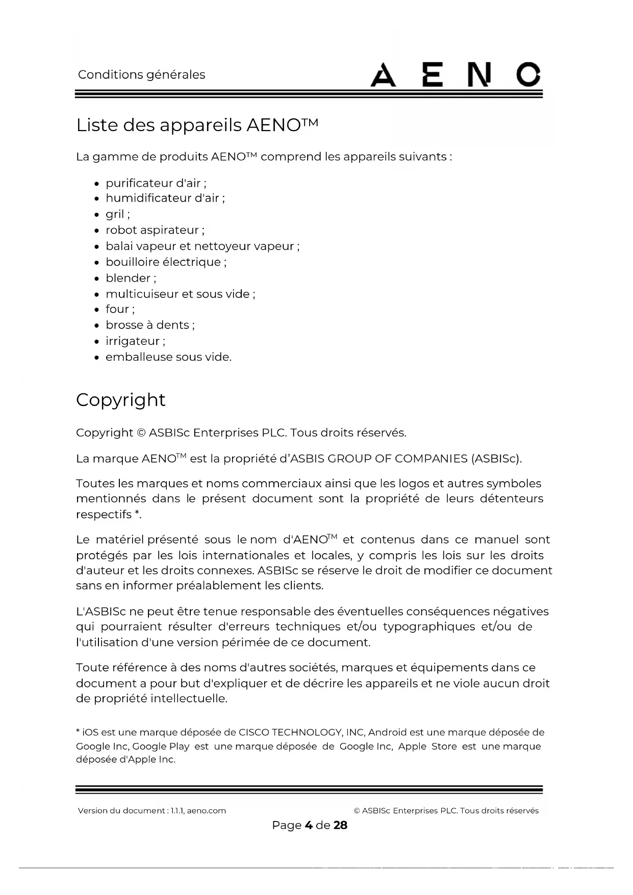 Version du document : 1.1.1, aeno.com © ASBISc Enterprises PLC. Tous droits réservés Page 24 de 28 Règles de stockage, de transport et d'élimination Le transport du produit est possible sur n'importe quelle distance par tout moyen de transport assurant la sécurité de l'appareil, conformément aux règles de transport de marchandises en vigueur sur ce mode de transport. L'eau ne doit pas pénétrer sur l'emballage et/ou le produit. Avant de stocker l'appareil, assurez-vous de le nettoyer et de le laisser sécher complètement. Stockez l'appareil dans un endroit sec et fermé, hors de portée des enfants et à l'écart des appareils de chauffage, en évitant la lumière directe du soleil et l'humidité. Conformément au règlement sur les déchets d'équipements électriques et électroniques (WEEE), tous les produits électriques et électroniques en fin de vie sont collectés séparément et ne peuvent pas être éliminés avec des déchets ménagers non triés. Les pièces des appareils en mauvais état doivent être séparées et triées par type de matériau. La collecte, le recyclage et l'élimination appropriés de ces appareils vous aideront à éviter les effets potentiels sur l'environnement et la santé humaine des substances nocives contenues dans leur composition. Pour le recyclage, l'appareil doit être transféré au point de recyclage local. La mise au rebut est effectuée conformément à la législation et aux réglementations en vigueur dans le pays concerné. Pour plus d'informations sur le recyclage de cet appareil, veuillez contacter le service d'élimination des déchets ménagers.Conditions générales