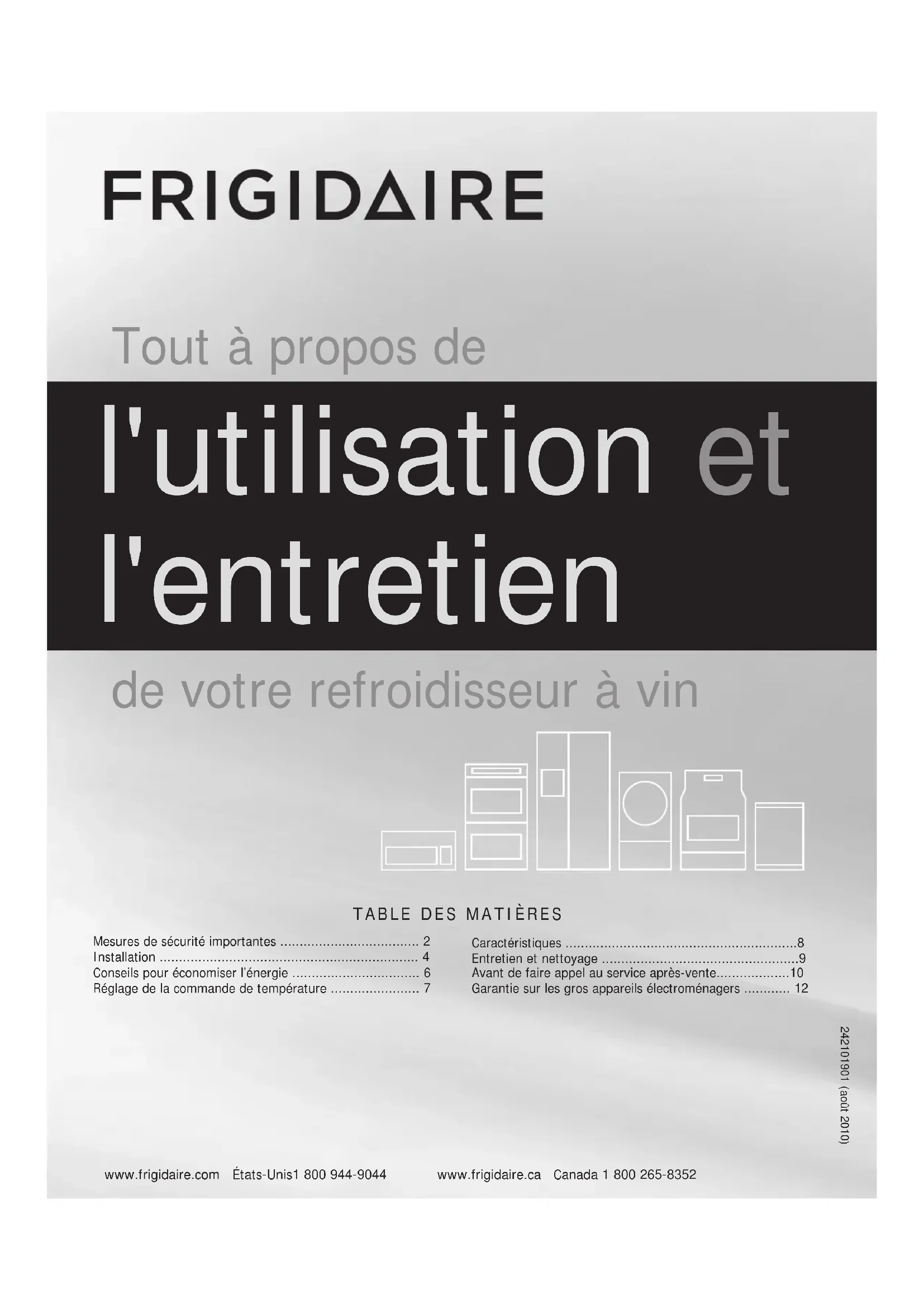 - www.frigidaire.com États-Unis1 800 944-9044 www.frigidaire.ca Canada 1 800 265-8352 Tout à propos de l'utilisation et l'entretien de votre refroidisseur à vin Mesures de sécurité importantes p. 2