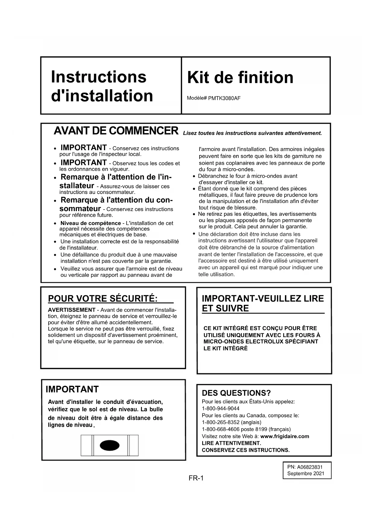 - Niveau de compétence - L'installation de cet appareil nécessite des compétences mécaniques et électriques de base.AVERTISSEMENT - Avant de commencer l'installa-tion, éteignez le panneau de service et verrouillez-le pour éviter d'être allumé accidentellement.Lorsque le service ne peut pas être verrouillé, fixez solidement un dispositif d'avertissement proéminent, tel qu'une étiquette, sur le panneau de service.CE KIT INTÉGRÉ EST CONÇU POUR ÊTRE UTILISÉ UNIQUEMENT AVEC LES FOURS À MICRO-ONDES ELECTROLUX SPÉCIFIANT LE KIT INTÉGRÉ Pour les clients aux États-Unis appelez: 1-800-944-9044 Pour les clients au Canada, composez le: 1-800-265-8352 (anglais) 1-800-668-4606 poste 8199 (français) Visitez notre site Web à: www.frigidaire.com LIRE ATTENTIVEMENT. CONSERVEZ CES INSTRUCTIONS. IMPORTANT Avant d'installer le conduit d'évacuation, vérifiez que le sol est de niveau. La bulle de niveau doit être à égale distance des lignes de niveau