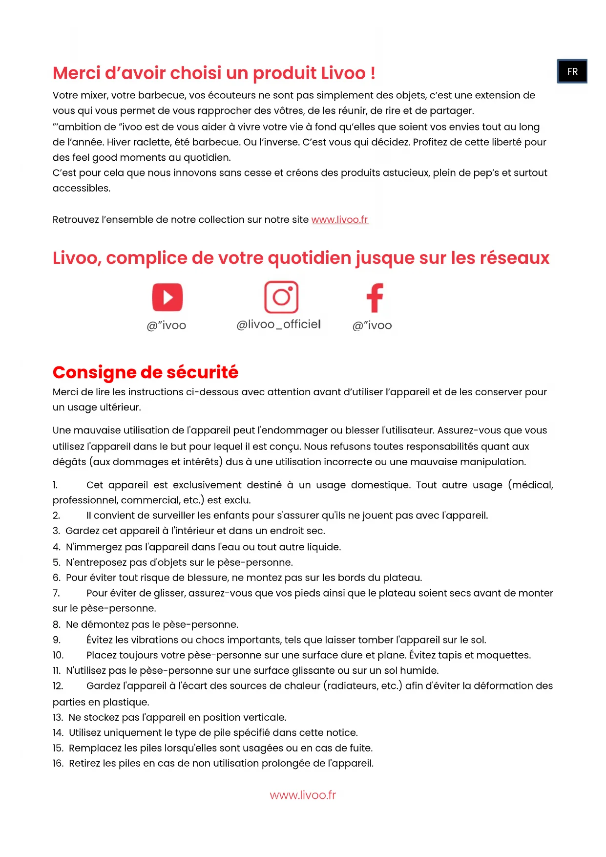 Version : v.1.xwww.livoo.fr Merci d’avoir choisi un produit Livoo ! Votre mixer, votre barbecue, vos écouteurs ne sont pas simplement des objets, c’est une extension de vous qui vous permet de vous rapprocher des vôtres, de les réunir, de rire et de partager. L’ambition de Livoo est de vous aider à vivre votre vie à fond qu’elles que soient vos envies tout au long de l’année. Hiver raclette, été barbecue. Ou l’inverse. C’est vous qui décidez. Profitez de cette liberté pour des feel good moments au quotidien. C’est pour cela que nous innovons sans cesse et créons des produits astucieux, plein de pep’s et surtout accessibles. Retrouvez l’ensemble de notre collection sur notre site www.livoo.fr Livoo, complice de votre quotidien jusque sur les réseaux