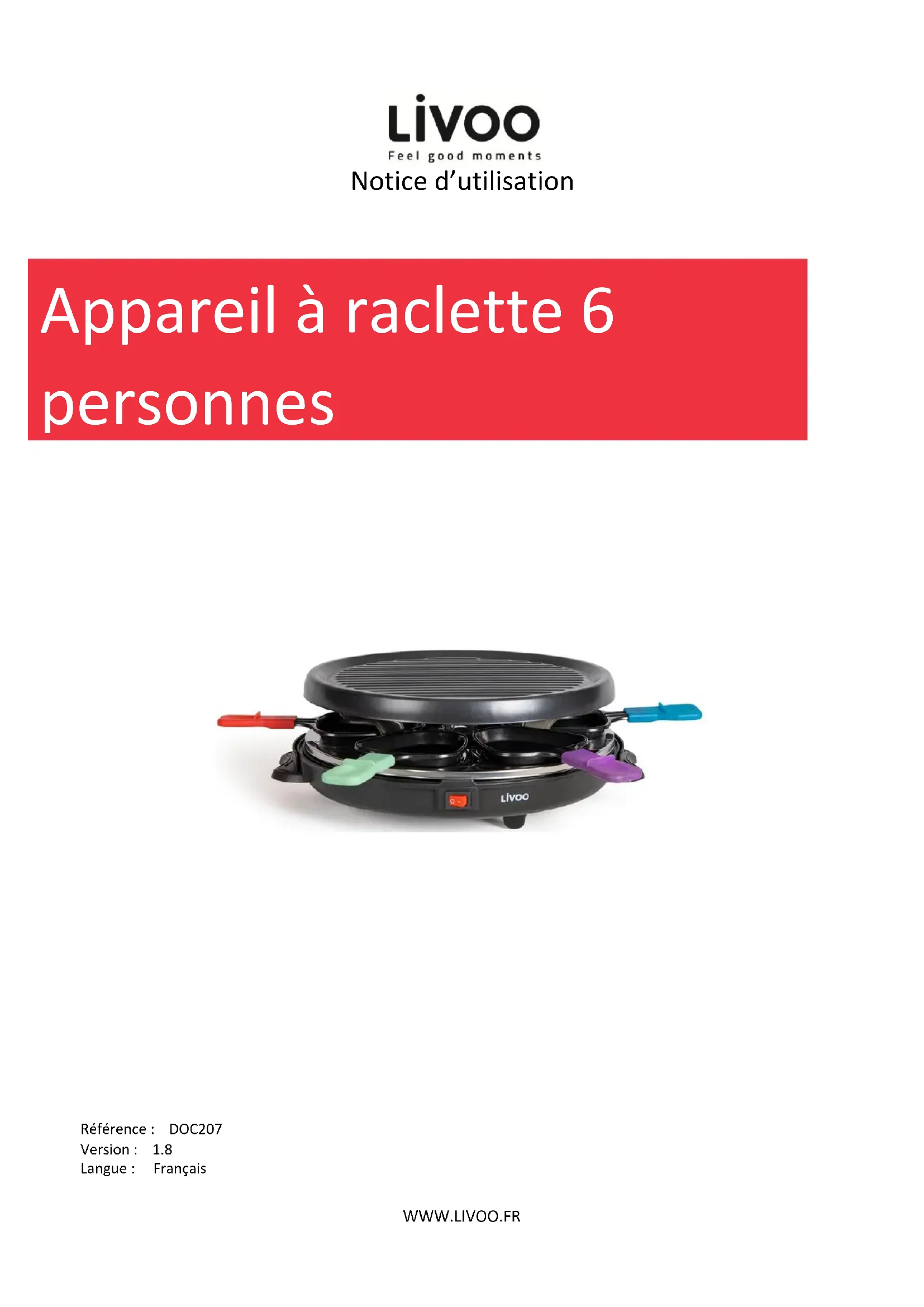 Référence : DOC207 Version : 1.8 Langue : Français Appareil à raclette 6 personnesNotice d’utilisation