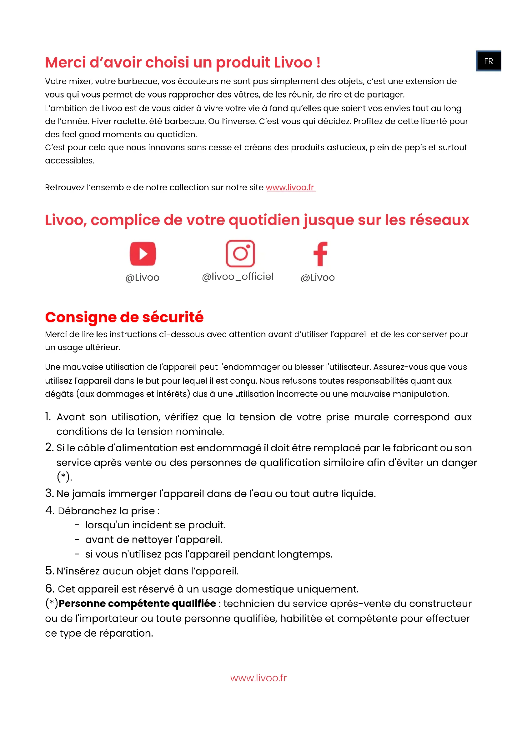 Mise au rebut correcte de l'appareil (Equipement électrique et électronique). (Applicable dans l'Union européenne et dans les autres pays d'Europe qui ont adopté des systèmes de collecte séparés). La directive Européenne 2012/19/EU sur les Déchets des Equipements Electriques et Electroniques (DEEE), exige que les appareils ménagers usagés ne soient pas jetés dans le flux normal des déchets ménagers. Les appareils usagés doivent être collectés séparément afin d'optimiser le taux de récupération et le recyclage des matériaux qui les composent et réduire l'impact sur la santé humaine et l'environnement. Le symbole de la poubelle barrée est apposé sur tous les produits pour rappeler les obligations de la collecte séparée. Les consommateurs devront contacter les autorités locales ou leur revendeur concernant la démarche à suivre pour l'enlèvement de leur appareil.www.livoo.fr Thank you for choosing a Livoo product! Your blender, your barbecue, and your headphones are not just objects, they are extensions of yourself, allowing you to get closer to your friends and family, to bring them together, to laugh and to share experiences. Livoo's aim is to help you live your life to the fullest, whatever wishes you have throughout the year. Winter raclette, summer barbecue. Or the other way around. It's up to you. Take advantage of this freedom for feel good moments every day. That's why we're constantly innovating and creating clever products full of zest, but most of all, accessible. Find our entire collection on our website www.livoo.en. Livoo, your daily companion till social networks