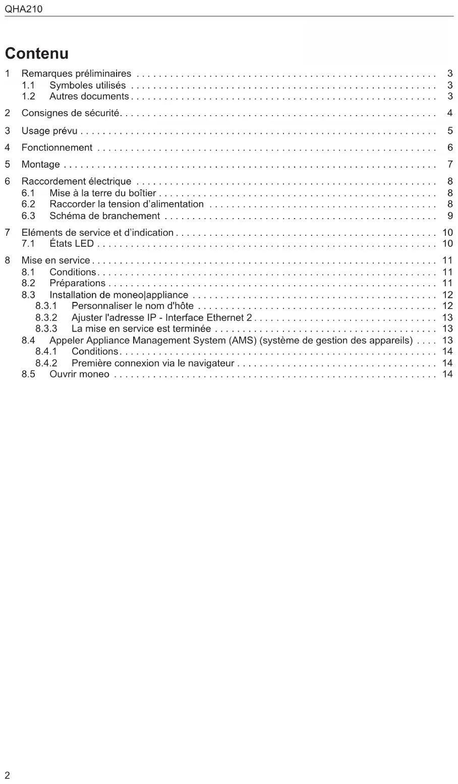 moneo|appliance Interface Ethernet Inscription sur l’appa- reil Description Adresse IP standard Masque de sous-ré- seau ETH1 A Réseau capteurs 192.168.0.100 255.255.255.0 ETH2 B Réseau informatique DHCP DHCP Après la mise sous tension, moneo|appliance peut être mis en marche à l’aide de l’interrupteur situé à l’avant de l’appareil. S’assurer que tous les câbles ont été connectés comme décrit. Au cas où l’utilisation d’un écran et/ou d’un clavier ne serait pas possible, la configuration initiale peut être effectuée directement via l’interface web AMS. Réseau informatique avec serveur DHCP actif : u Connecter l’écran (si disponible) à moneo appliance ou vérifier le serveur DHCP. u Lire l’adresse IP attribuée au réseau informatique dans l’écran de connexion (configuration initiale avec écran) ou appeler l’entrée correspondante dans le serveur DHCP (sur la base de l’adresse MAC). u Accès à l’interface web AMS via l’URL suivante : https://<adresse_IP_déterminée>/ams u Effectuer la configuration initiale de moneo appliance. Réseau informatique sans serveur DHCP actif : u Connecter le PC ou PC portable au réseau informatique (ETH2) de moneo appliance. u Configurer une adresse IP statique pour le PC/PC portable. Plage d’adresses : 192.168.0.1...254 (sauf 192.168.0.100) Masque de sous-réseau : 255.255.255.0 u Accéder à l’interface web AMS via l’URL https://192.168.0.100/ams. u Effectuer la configuration initiale de moneo appliance.QHA210