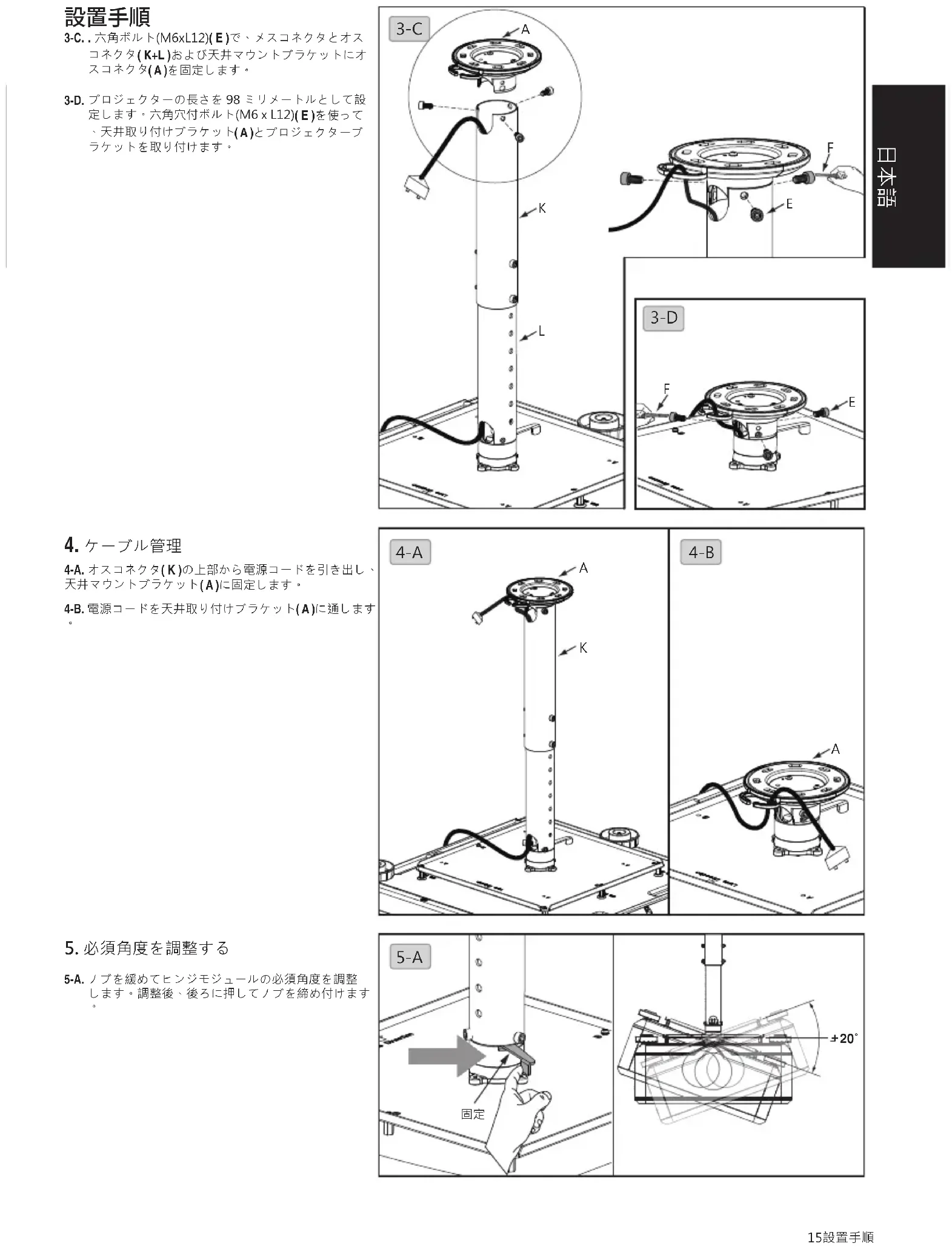 3-C. Fixez les tubes interne et externe ( K+L) et le support de montage au plafond ( A ) avec les boulons à tête hexagonale (M6xL12) ( E ). 3-D. Réglez la longueur du projecteur sur 98mm Utilisez le boulon hex interne (M6Xl12) ( E ) pour attacher le support de plafond ( A ) et le support du projecteur 5-A. Ajustez l'angle nécessaire pour le module charnière en desserrant le bouton. Après ajustement, repousser et serrez le bouton.1. Bitte lesen Sie die Anweisungen in dieser Anleitung aufmerksam durch und halten Sie sich stets daran. Iewahren Sie die Anleitung auf, damit Sie später darin nachlesen können.
