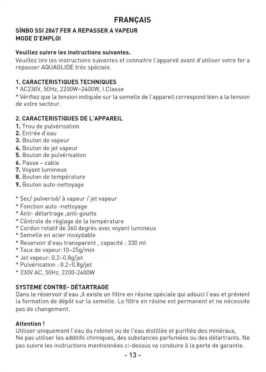 Veuillez suivre les instructions suivantes. Veuillez lire les instructions suivantes et connaitre l’appareil avant d’utiliser votre fer a repasser AQUAGLIDE trés spéciale.