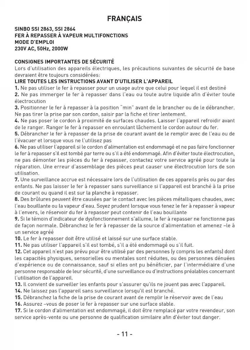 SSI 2863 - Fer à repasser SINBO - Notice d'utilisation et mode d'emploi gratuit