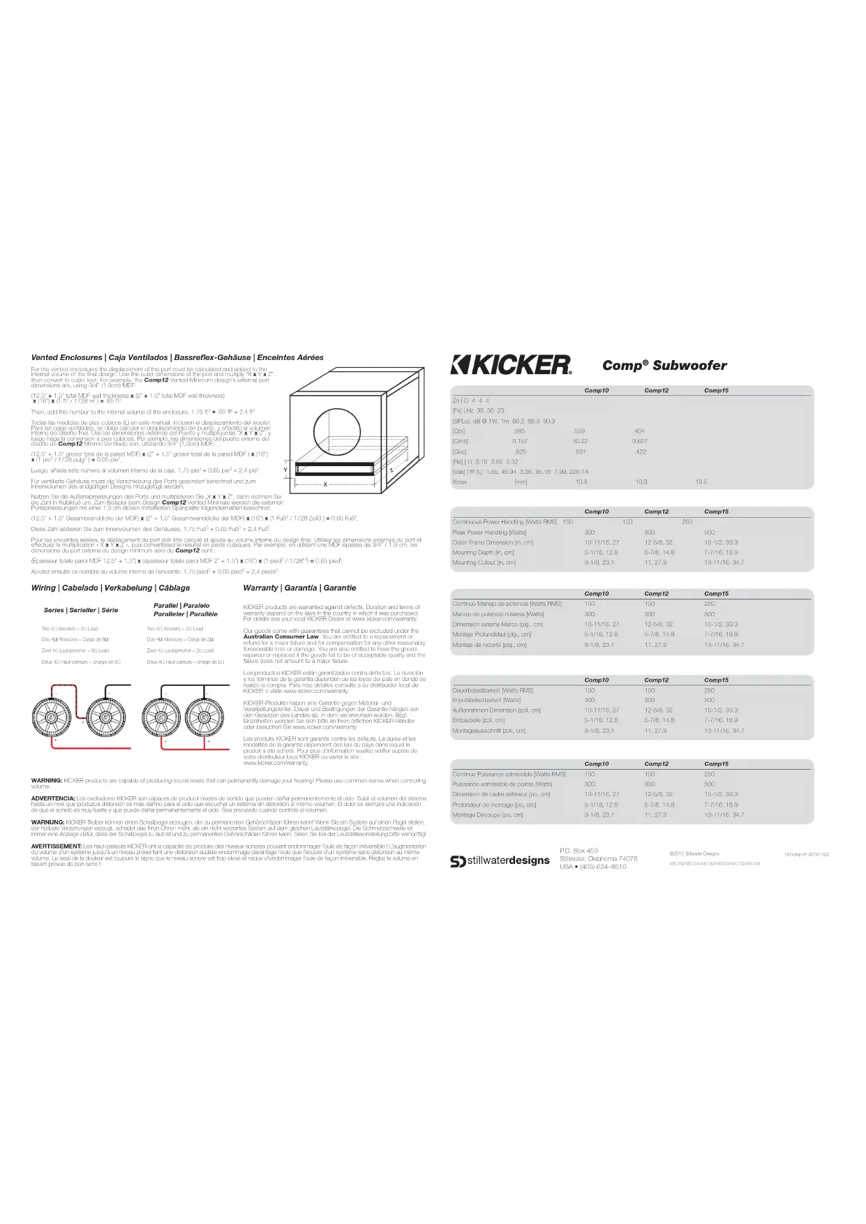 Pour les enceintes aérées, le déplacement du port doit être calculé et ajouté au volume interne du design fi nal. Utilisez les dimensions externes du port et effectuez la multiplication « X x Y x Z », puis convertissez le résultat en pieds cubiques. Par exemple, en utilisant une MDF épaisse de 3/4” / 1,9 cm, les dimensions du port externe du design minimum aéré du Comp12 sont : (Épaisseur totale paroi MDF 12,5” + 1,5”) x (épaisseur totale paroi MDF 2” + 1,5”) x (16”) x (1 pied