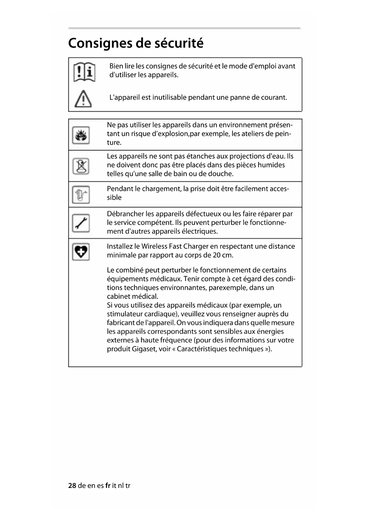 | Installez le Wireless Fast Charger en respectant une distance minimale par rapport au corps de 20 cm. Le combiné peut perturber le fonctionnement de certains équipements médicaux. Tenir compte à cet égard des condi- tions techniques environnantes, parexample, dans un cabinet Médical. Si vous utilisez des appareils médicaux (par exemple, un stimulateur cardiaque), veuillez vous renseigner auprès du fabricant de l'appareil. On vous indiquera dans chaque mesure les appareils correspondants sont sensibles aux énergies externes à haute fréquence (pour des informations sur votre produit Gigaset, voir « Caractéristiques techniques »). |