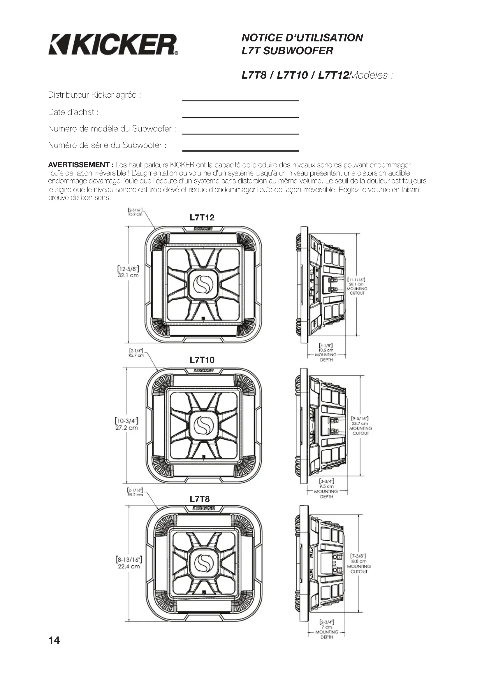 Distributeur Kicker agréé : Date d’achat : Numéro de modèle du Subwoofer : Numéro de série du Subwoofer : L7T8 / L7T10 / L7T12Modèles :