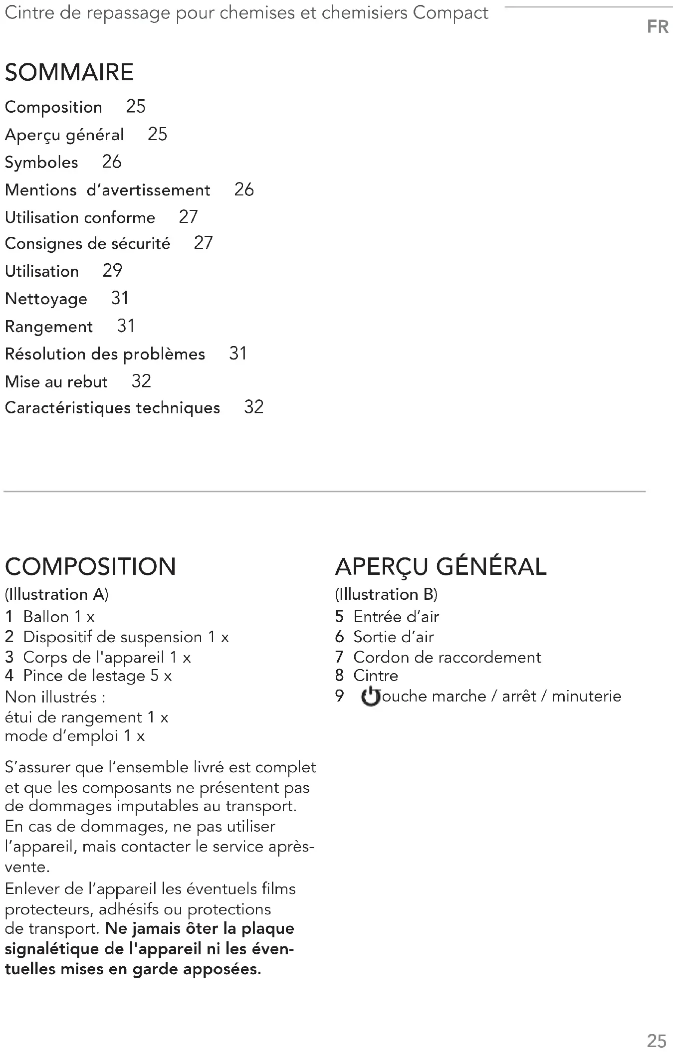 mité de baignoires, bacs à douche ou autres récipients contenant de l'eau. ATTENTION, surface chaude! À l'utilisation, l’appareil et ses accessoires (pinces incluses) deviennent brûlants. Ils ne doivent donc pas être touchés ni pendant l'utilisa- tion, ni directement après l'utilisation. ■ L'appareil doit toujours être arrêté et débranché du secteur lorsqu'il n'est pas utilisé ou avant d'être nettoyé. ■ L’appareil ne doit pas rester sans surveillance tant qu'il est raccordé au réseau électrique. ■ Ne procéder à aucune modification sur l’appareil. Ne pas remplacer soi-même le cordon de raccordement. Si l’appareil ou son cordon de raccordement sont endommagés, c’est au fabricant, au service après-vente ou à toute personne aux qua- lifications similaires (par ex. un atelier spécialisé) qu’il revient de les remplacer afin d’éviter tout danger. ■ Laisser l'appareil refroidir intégralement avant de le nettoyer ou de le ranger. DANGER – Risque d'électrocution! ■ Utiliser et ranger l'appareil unique- ment à l’intérieur. ■ Ne pas faire fonctionner ni stocker l’appareil dans des pièces à fort taux d’humidité. ■ Ne jamais plonger l'appareil et le cordon de raccordement dans l'eau ou tout autre liquide et s’assurer qu'ils ne risquent pas de tomber dans l'eau ou d'être mouillés. ■ Si l'appareil devait tomber à l'eau pendant qu'il est encore raccordé au secteur, retirer immédiatement la fiche de la prise. Extraire ensuite seulement l'appareil de l’eau! Avant toute re- mise en service, le faire contrôler dans un atelier spécialisé. ■ Ne jamais saisir l’appareil ni le cordon de raccordement avec les mains hu- mides lorsque l’appareil est raccordé au réseau électrique. AVERTISSEMENT – Risque d'incendie! ■ Ne pas utiliser l'appareil à proximité de matériaux inflammables. ■ Ne jamais couvrir les orifices d'aé- ration du corps de l’appareil et n'y insérer aucun objet. AVERTISSEMENT – Risque de blessures! ■ Ne pas laisser les emballages à la portée des enfants et des animaux. Risque de suffocation! ■ S’assurer de toujours tenir le cordon de raccordement hors de portée desCintre de repassage pour chemises et chemisiers Compact