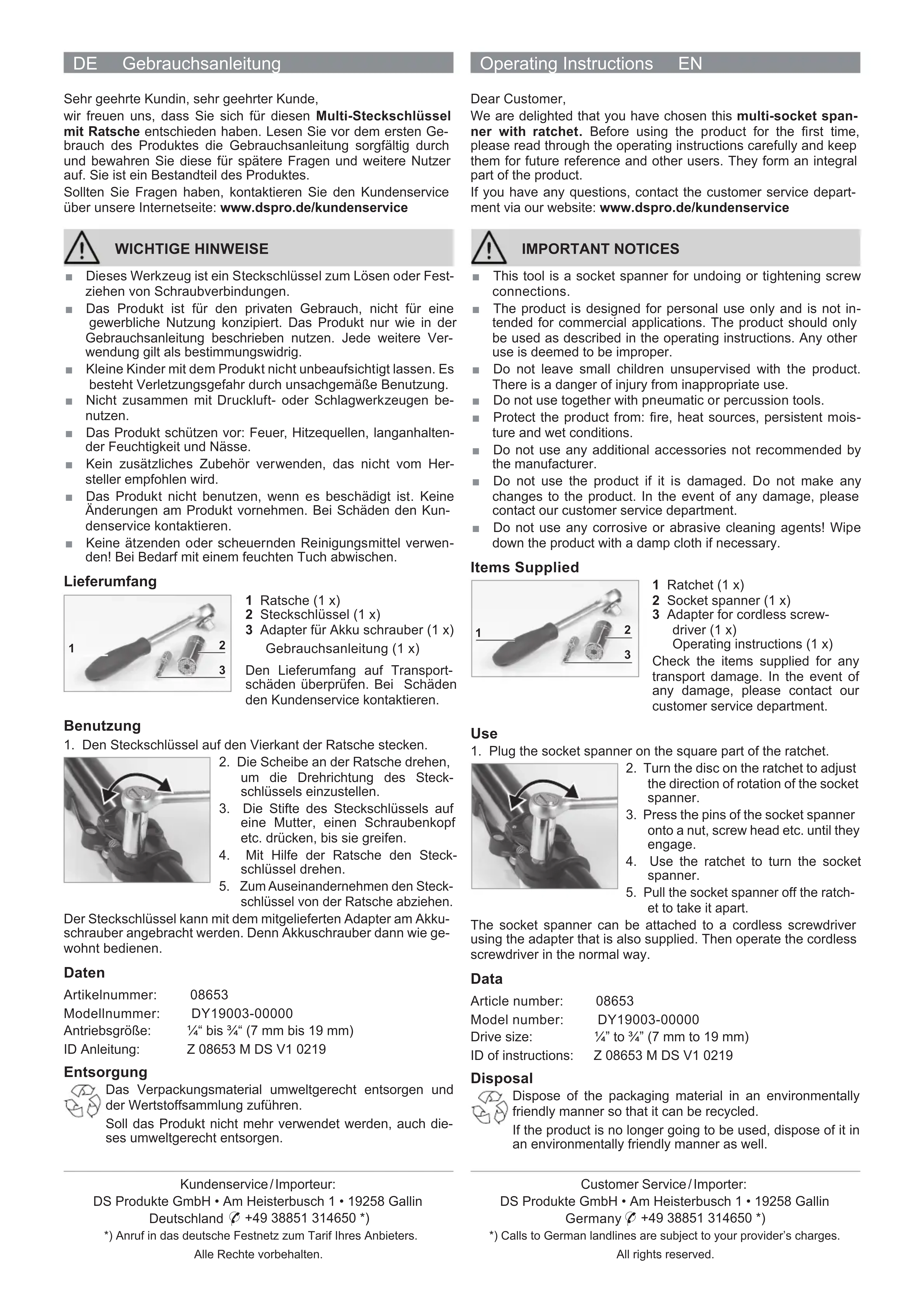 et to take it apart. The socket spanner can be attached to a cordless screwdriver using the adapter that is also supplied. Then operate the cordless screwdriver in the normal way. Data Article number: 08653 Model number: DY19003-00000 Drive size: ¼” to ¾” (7 mm to 19 mm) ID of instructions: Z 08653 M DS V1 0219 Disposal Dispose of the packaging material in an environmentally friendly manner so that it can be recycled. If the product is no longer going to be used, dispose of it in an environmentally friendly manner as well.FR Mode d'emploi Service après-vente / importateur : DS Produkte GmbH • Am Heisterbusch 1 • 19258 Gallin Allemagne ✆ +49 38851 314650 *) *) Prix d’un appel vers le réseau fi xe allemand au tarif de votre fournisseur. Tous droits réservés. Gebruikershandleiding NL Klantenservice / importeur: DS Produkte GmbH • Am Heisterbusch 1 • 19258 Gallin Duitsland ✆ +49 38851 314650 *) *) Bellen naar het Duitse vaste netwerk tegen het tarief van uw provider. Alle rechten voorbehouden. Chère cliente, cher client, Nous vous félicitons d'avoir fait l'acquisition de cette clé à cliquet avec douille à picots multiples. Veuillez lire attentivement le pré- sent mode d'emploi avant la première utilisation de ce produit et le conserver précieusement pour toute question ultérieure ainsi que pour les autres utilisateurs. Il fait partie intégrante du produit. Pour toute question, veuillez contacter le service après-vente depuis notre site Internet : www.dspro.de/kundenservice AVIS IMPORTANTS ■ Cet outil est une clé à cliquet servant à serrer ou desserrer des ensembles vissés. ■ Le produit est conçu pour un usage domestique, non profes- sionnel. Il doit être utilisé uniquement tel qu'indiqué dans le mode d'emploi. Toute autre utilisation est considérée comme non conforme. ■ Ne laissez pas les jeunes enfants sans surveillance en pré- sence du produit. Risque de blessures en cas d'utilisation non conforme ! ■ N’utilisez pas le produit avec des outils à air comprimé ou à percussion. ■ Veillez à ce que le produit ne soit pas exposé au feu, à des sources de chaleur, à l’humidité prolongée et à la pluie. ■ N'utilisez pas d'accessoires supplémentaires que le fabricant n'aurait pas recommandés. ■ N'utilisez pas le produit s'il est endommagé. Ne procédez à aucune modifi cation du produit. En cas d'endommagement, contactez le service après-vente. ■ N'utilisez pas de produits de nettoyage corrosifs ou abrasifs. Au besoin, passez un chiffon humide. Composition
