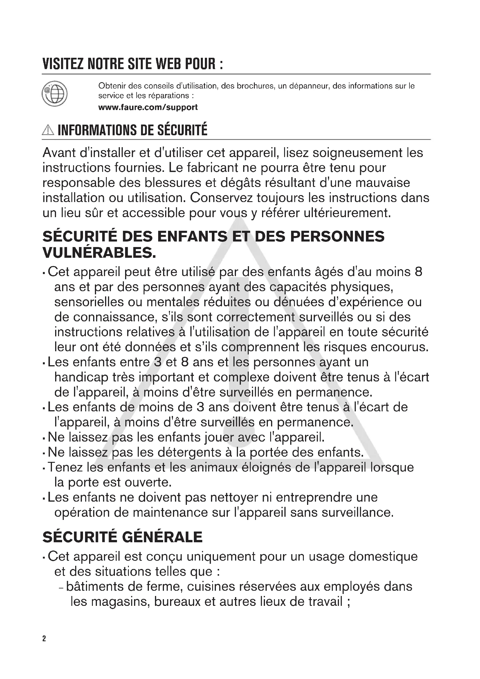 Avant d'installer et d'utiliser cet appareil, lisez soigneusement les instructions fournies. Le fabricant ne pourra être tenu pour responsable des blessures et dégâts résultant d'une mauvaise installation ou utilisation. Conservez toujours les instructions dans un lieu sûr et accessible pour vous y référer ultérieurement. SÉCURITÉ DES ENFANTS ET DES PERSONNES VULNÉRABLES.
