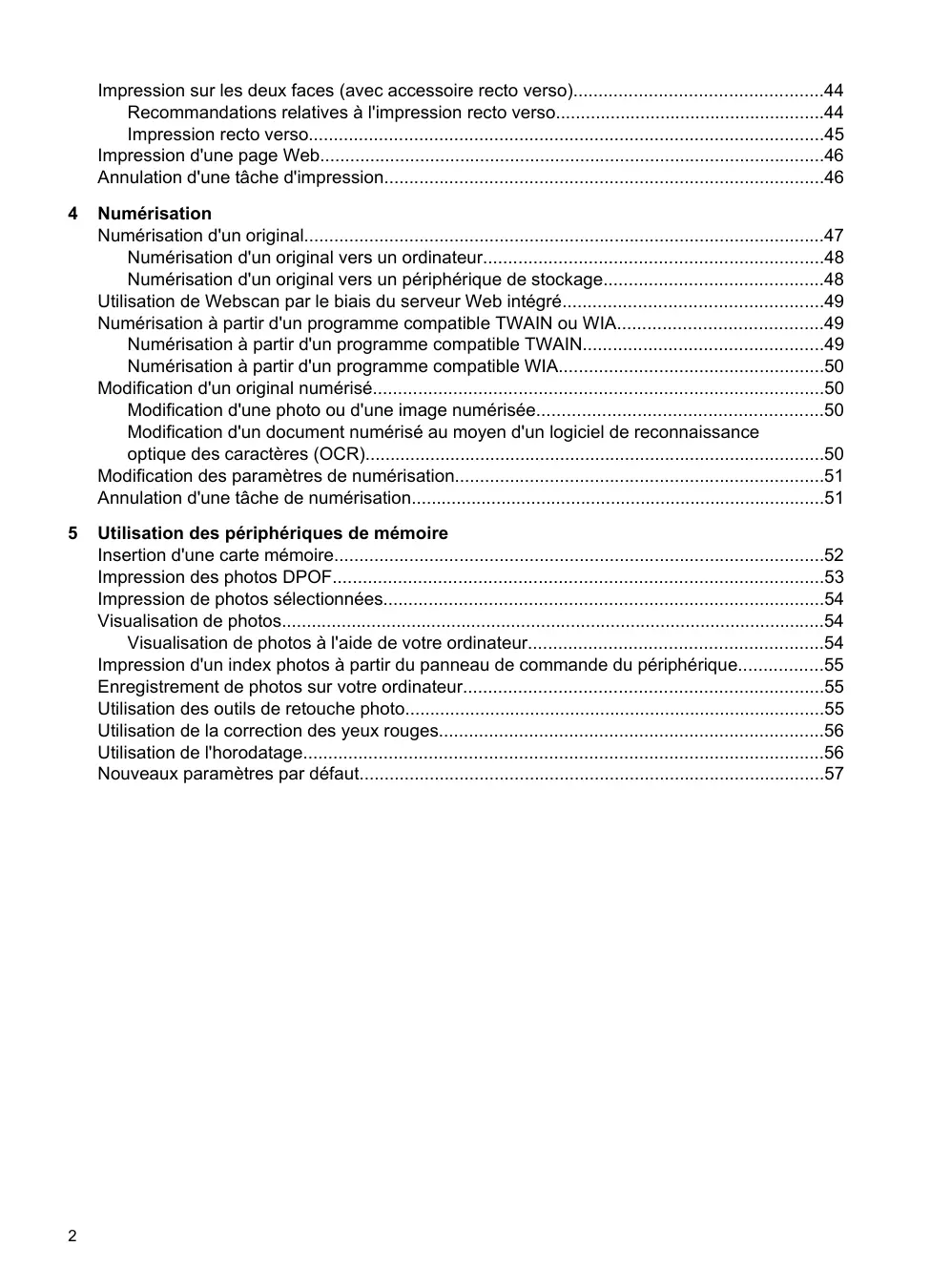 Utilisation des périphériques de mémoire Insertion d'une carte mémoire52 Impression des photos DPOF53 Impression de photos sélectionnées54 Visualisation de photos54 Visualisation de photos à l'aide de votre ordinateur54 Impression d'un index photos à partir du panneau de commande du périphérique55 Enregistrement de photos sur votre ordinateur55 Utilisation des outils de retouche photo55 Utilisation de la correction des yeux rouges56 Utilisation de l'horodatage56 Nouveaux paramètres par défaut57