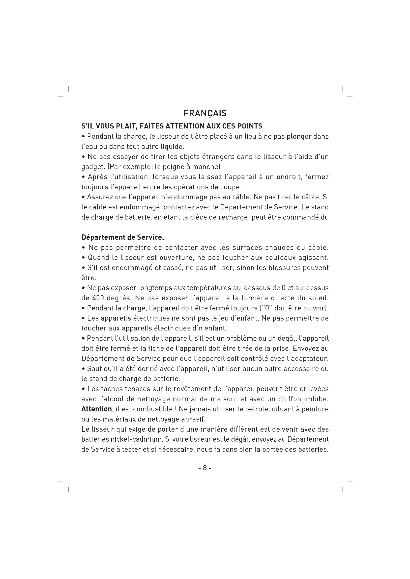 - Les taches tenaces sur le revêtement de l’appareil peuvent être enlevées avec l’alcool de nettoyage normal de maison et avec un chiffon imbibé. Attention, il est combustible ! Ne jamais utiliser le pétrole, diluant à peinture ou les matériaux de nettoyage abrasif. Le lisseur qui exige de porter d’une manière différent est de venir avec des batteries nickel-cadmium. Si votre lisseur est le dégât, envoyez au Département de Service à tester et si nécessaire, nous faisons bien la portée des batteries.- 9 -