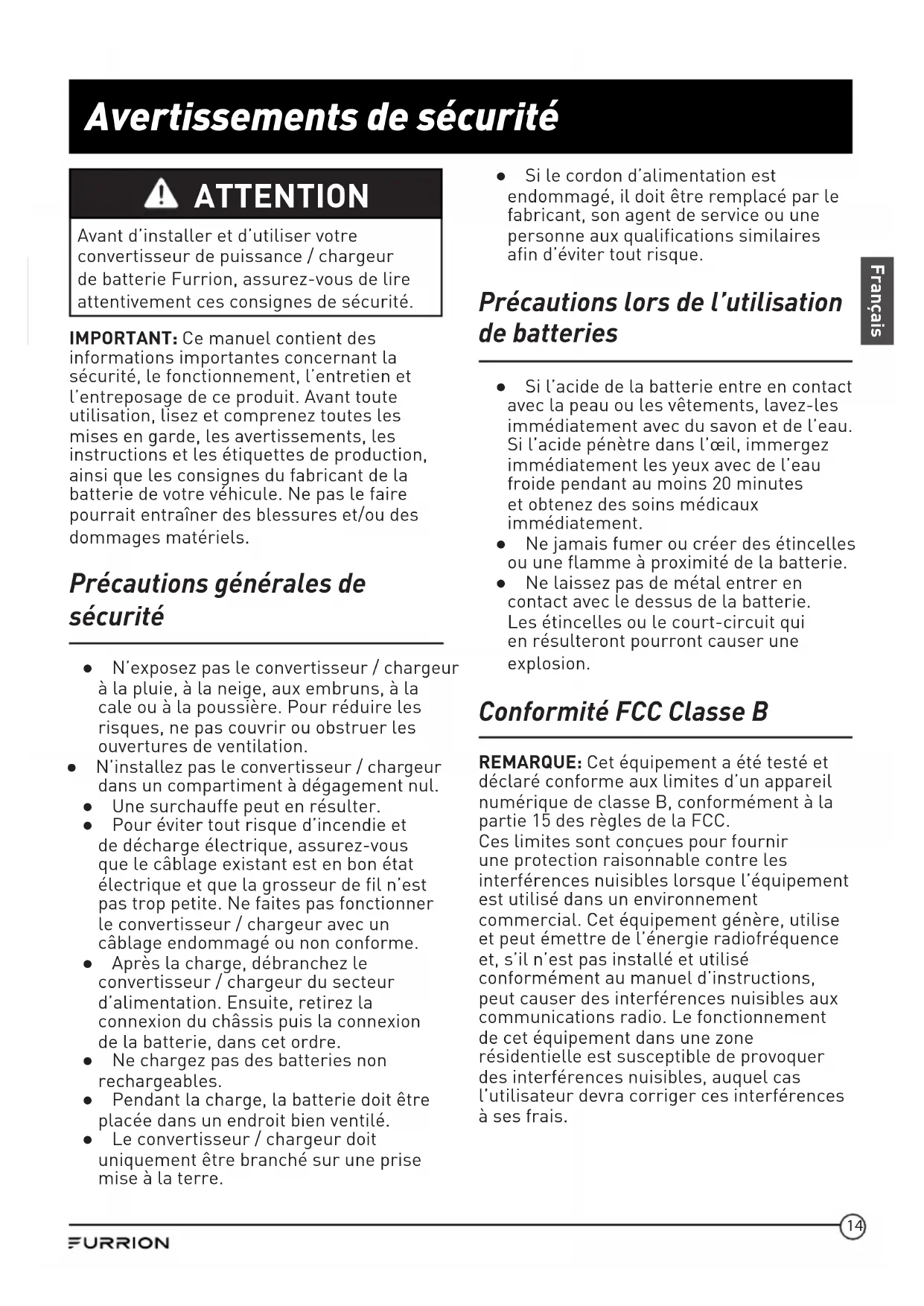 - Dépannage Avertissements de sécurité Français ATTENTION Avant d’installer et d’utiliser votre convertisseur de puissance / chargeur de batterie Furrion, assurez-vous de lire attentivement ces consignes de sécurité. IMPORTANT: Ce manuel contient des informations importantes concernant la sécurité, le fonctionnement, l’entretien et l’entreposage de ce produit. Avant toute utilisation, lisez et comprenez toutes les mises en garde, les avertissements, les instructions et les étiquettes de production, ainsi que les consignes du fabricant de la batterie de votre véhicule. Ne pas le faire pourrait entraîner des blessures et/ou des dommages matériels. Précautions générales de sécurité ● N’exposez pas le convertisseur / chargeur à la pluie, à la neige, aux embruns, à la cale ou à la poussière. Pour réduire les risques, ne pas couvrir ou obstruer les ouvertures de ventilation. ● N’installez pas le convertisseur / chargeur dans un compartiment à dégagement nul. ● Une surchauffe peut en résulter. ● Pour éviter tout risque d’incendie et de décharge électrique, assurez-vous que le câblage existant est en bon état électrique et que la grosseur de fil n’est pas trop petite. Ne faites pas fonctionner le convertisseur / chargeur avec un câblage endommagé ou non conforme. ● Après la charge, débranchez le convertisseur / chargeur du secteur d’alimentation. Ensuite, retirez la connexion du châssis puis la connexion de la batterie, dans cet ordre. ● Ne chargez pas des batteries non rechargeables. ● Pendant la charge, la batterie doit être placée dans un endroit bien ventilé. ● Le convertisseur / chargeur doit uniquement être branché sur une prise mise à la terre. ● Si le cordon d’alimentation est endommagé, il doit être remplacé par le fabricant, son agent de service ou une personne aux qualifications similaires afin d’éviter tout risque. Précautions lors de l’utilisation de batteries ● Si l’acide de la batterie entre en contact avec la peau ou les vêtements, lavez-les immédiatement avec du savon et de l’eau. Si l’acide pénètre dans l’œil, immergez immédiatement les yeux avec de l’eau froide pendant au moins 20minutes et obtenez des soins médicaux immédiatement. ● Ne jamais fumer ou créer des étincelles ou une flamme à proximité de la batterie. ● Ne laissez pas de métal entrer en contact avec le dessus de la batterie. Les étincelles ou le court-circuit qui en résulteront pourront causer une explosion. Conformité FCC Classe B REMARQUE: Cet équipement a été testé et déclaré conforme aux limites d’un appareil numérique de classe B, conformément à la partie15 des règles de la FCC. Ces limites sont conçues pour fournir une protection raisonnable contre les interférences nuisibles lorsque l’équipement est utilisé dans un environnement commercial. Cet équipement génère, utilise et peut émettre de l’énergie radiofréquence et, s’il n’est pas installé et utilisé conformément au manuel d’instructions, peut causer des interférences nuisibles aux communications radio. Le fonctionnement de cet équipement dans une zone résidentielle est susceptible de provoquer des interférences nuisibles, auquel cas l’utilisateur devra corriger ces interférences à ses frais.15 À propos de votre produit Français Comment fonctionne votre convertisseur Le convertisseur de puissance / chargeur de batterie Furrion convertit 120Vc.a. en 13,6Vc.c. En tant que bloc d’alimentation, il permet à l’utilisateur d’exploiter toute charge continue nominale de 12voltsc.c. jusqu’au courant de sortie nominal du convertisseur pour la charge de résistance et permet une charge inductive inférieure à 1/4 de la charge. En tant que chargeur de batterie, le convertisseur maintiendra la charge de la batterie, délivrant son courant nominal lorsque la capacité de la batterie deviendra suffisamment faible. La tension est réglée pour qu’il fournisse son courant maximum pendant la période de temps nécessaire, ce qui minimise les contraintes excessives à la batterie causées par le réchauffement de ses cellules. Cela permet d’assurer la plus longue durée de vie possible de la batterie. Au fil du temps, à mesure que la batterie atteint sa pleine capacité, le convertisseur maintiendra la charge de la batterie pour empêcher l’auto-décharge de ses cellules. Caractéristiques opérationnelles Capacités du convertisseur / chargeur jusqu’à 60 A pour le modèle FCVSDC60A et 80 A pour le modèle FCVSDC80A. Accès facile aux fusibles de protection de la batterie contre l’inversion. Contrôle intelligent de la vitesse du ventilateur. Détaration thermique intelligente et protection contre les coupures. Batterie sans entretien - un nouveau cycle de charge commence tous les 21jours. État de charge multiple pour garder votre batterie en bon état. Le convertisseur de puissance / chargeur de batterie Furrion est conçu avec des composants de haute qualité pour assurer des années d’utilisation continue. p. 2214