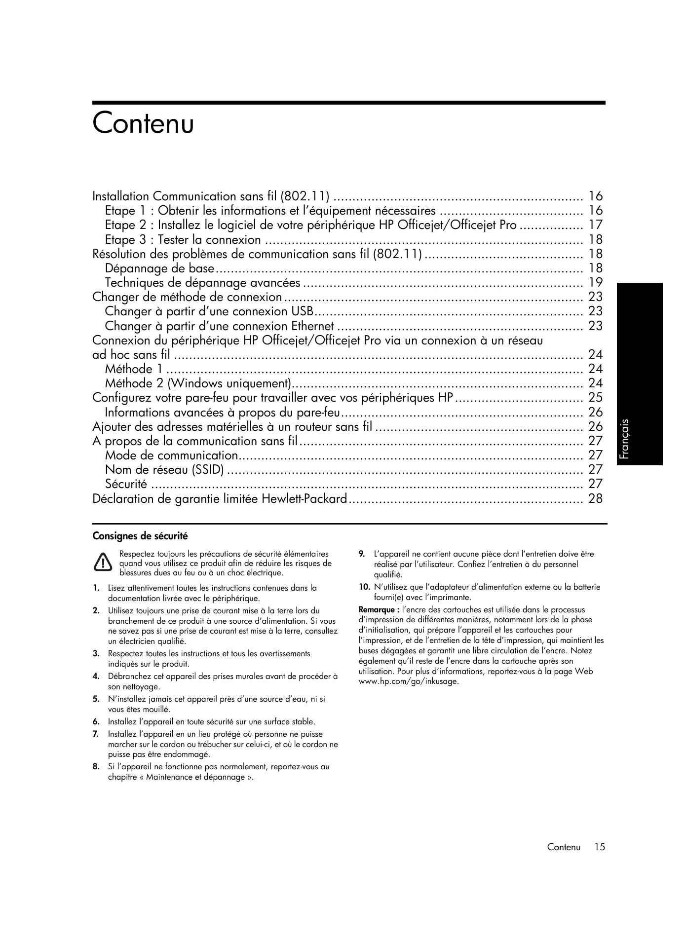 Etape 1 : Obtenir les informations et l’équipement nécessaires Etape 2 : Installez le logiciel de votre périphérique HP Officejet/Officejet Pro Etape 3 : Tester la connexion Résolution des problèmes de communication sans fil (802.11) Dépannage de base Techniques de dépannage avancées Changer de méthode de connexion Changer à partir d’une connexion USB Changer à partir d’une connexion Ethernet Connexion du périphérique HP Officejet/Officejet Pro via un connexion à un réseau ad hoc sans fil Méthode 1 Méthode 2 (Windows uniquement) Configurez votre pare-feu pour travailler avec vos périphériques HP Informations avancées à propos du pare-feu Ajouter des adresses matérielles à un routeur sans fil A propos de la communication sans fil Mode de communication Nom de réseau (SSID) Sécurité Déclaration de garantie limitée Hewlett-Packard