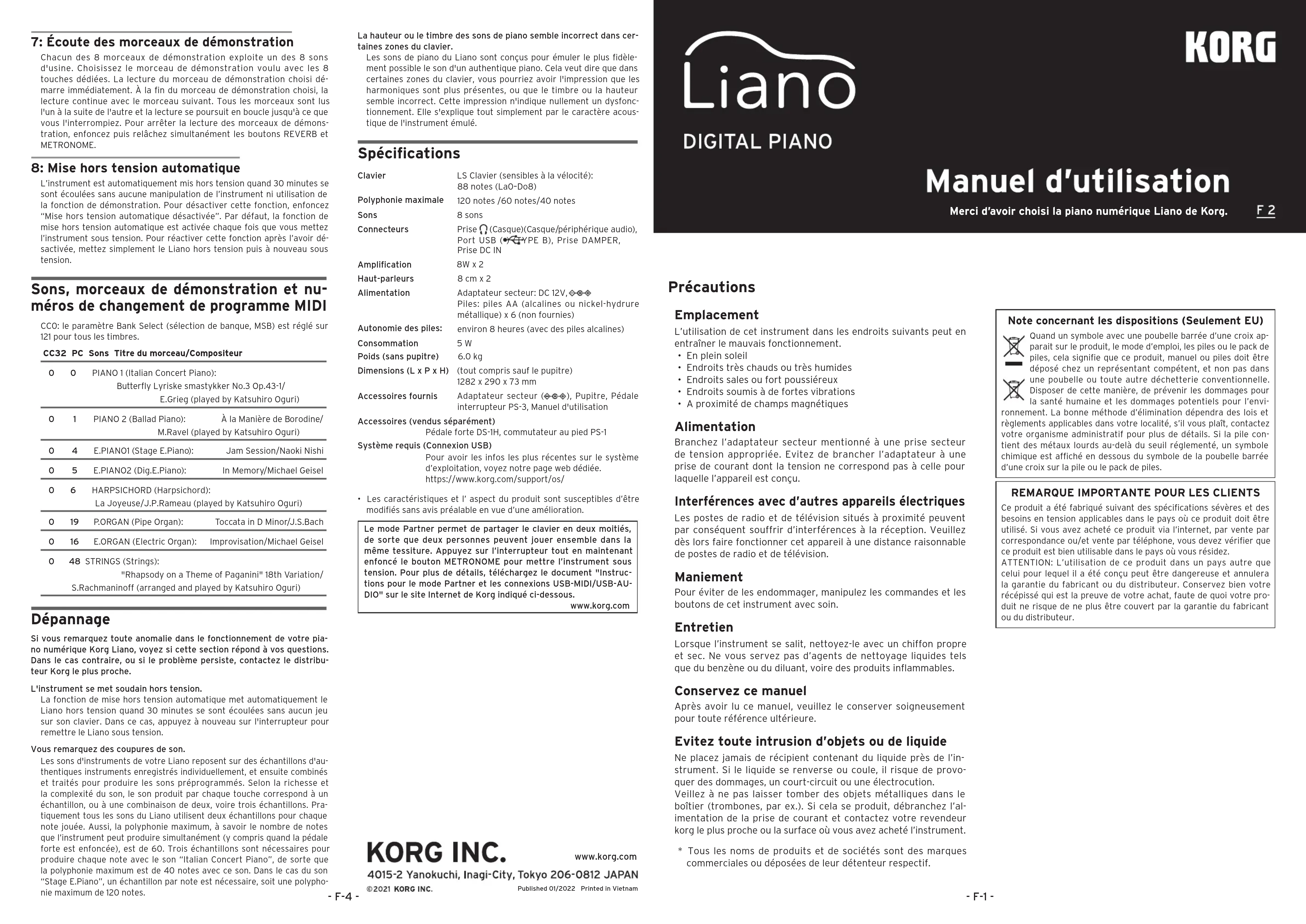 Ce produit a été fabriqué suivant des spécifications sévères et des besoins en tension applicables dans le pays où ce produit doit être utilisé. Si vous avez acheté ce produit via l’internet, par vente par correspondance ou/et vente par téléphone, vous devez vérifier que ce produit est bien utilisable dans le pays où vous résidez.ATTENTION: L’utilisation de ce produit dans un pays autre que celui pour lequel il a été conçu peut être dangereuse et annulera la garantie du fabricant ou du distributeur. Conservez bien votre récépissé qui est la preuve de votre achat, faute de quoi votre pro-duit ne risque de ne plus être couvert par la garantie du fabricant ou du distributeur. www.korg.com Merci d’avoir choisi la piano numérique Liano de Korg. Published 01/2022 Printed in Vietnam 7: Écoute des morceaux de démonstration Chacun des 8 morceaux de démonstration exploite un des 8 sons d'usine. Choisissez le morceau de démonstration voulu avec les 8 touches dédiées. La lecture du morceau de démonstration choisi dé-marre immédiatement. À la fin du morceau de démonstration choisi, la lecture continue avec le morceau suivant. Tous les morceaux sont lus l'un à la suite de l'autre et la lecture se poursuit en boucle jusqu'à ce que vous l'interrompiez. Pour arrêter la lecture des morceaux de démons-tration, enfoncez puis relâchez simultanément les boutons REVERB et METRONOME. 8: Mise hors tension automatique L’instrument est automatiquement mis hors tension quand 30 minutes se sont écoulées sans aucune manipulation de l’instrument ni utilisation de la fonction de démonstration. Pour désactiver cette fonction, enfoncez “Mise hors tension automatique désactivée”. Par défaut, la fonction de mise hors tension automatique est activée chaque fois que vous mettez l’instrument sous tension. Pour réactiver cette fonction après l’avoir dé-sactivée, mettez simplement le Liano hors tension puis à nouveau sous tension. Sons, morceaux de démonstration et nu- méros de changement de programme MIDI CC0: le paramètre Bank Select (sélection de banque, MSB) est réglé sur 121 pour tous les timbres. CC32 PC Sons Titre du morceau/Compositeur 0 0 PIANO 1 (Italian Concert Piano): Butterfly Lyriske smastykker No.3 Op.43-1/ E.Grieg (played by Katsuhiro Oguri) 0 1 PIANO 2 (Ballad Piano): À la Manière de Borodine/ M.Ravel (played by Katsuhiro Oguri) 0 4 E.PIANO1 (Stage E.Piano): Jam Session/Naoki Nishi 0 5 E.PIANO2 (Dig.E.Piano): In Memory/Michael Geisel 0 6 HARPSICHORD (Harpsichord): La Joyeuse/J.P.Rameau (played by Katsuhiro Oguri) 0 19 P.ORGAN (Pipe Organ): Toccata in D Minor/J.S.Bach 0 16 E.ORGAN (Electric Organ): Improvisation/Michael Geisel 0 48 STRINGS (Strings): "Rhapsody on a Theme of Paganini" 18th Variation/ S.Rachmaninoff (arranged and played by Katsuhiro Oguri) Dépannage Si vous remarquez toute anomalie dans le fonctionnement de votre pia-no numérique Korg Liano, voyez si cette section répond à vos questions. Dans le cas contraire, ou si le problème persiste, contactez le distribu-teur Korg le plus proche.L'instrument se met soudain hors tension.La fonction de mise hors tension automatique met automatiquement le Liano hors tension quand 30 minutes se sont écoulées sans aucun jeu sur son clavier. Dans ce cas, appuyez à nouveau sur l'interrupteur pour remettre le Liano sous tension.Vous remarquez des coupures de son.Les sons d'instruments de votre Liano reposent sur des échantillons d'au-thentiques instruments enregistrés individuellement, et ensuite combinés et traités pour produire les sons préprogrammés. Selon la richesse et la complexité du son, le son produit par chaque touche correspond à un échantillon, ou à une combinaison de deux, voire trois échantillons. Pra-tiquement tous les sons du Liano utilisent deux échantillons pour chaque note jouée. Aussi, la polyphonie maximum, à savoir le nombre de notes que l’instrument peut produire simultanément (y compris quand la pédale forte est enfoncée), est de 60. Trois échantillons sont nécessaires pour produire chaque note avec le son “Italian Concert Piano”, de sorte que la polyphonie maximum est de 40 notes avec ce son. Dans le cas du son “Stage E.Piano”, un échantillon par note est nécessaire, soit une polypho-nie maximum de 120 notes. - F-1 -- F-4 - La hauteur ou le timbre des sons de piano semble incorrect dans cer-taines zones du clavier.Les sons de piano du Liano sont conçus pour émuler le plus fidèle-ment possible le son d'un authentique piano. Cela veut dire que dans certaines zones du clavier, vous pourriez avoir l'impression que les harmoniques sont plus présentes, ou que le timbre ou la hauteur semble incorrect. Cette impression n'indique nullement un dysfonc-tionnement. Elle s'explique tout simplement par le caractère acous-tique de l'instrument émulé. Spécifications Clavier LS Clavier (sensibles à la vélocité): 88 notes (La0–Do8)Polyphonie maximale 120 notes /60 notes/40 notesSons 8 sons Connecteurs Prise (Casque)(Casque/périphérique audio), Port USB ( ) (TYPE B), Prise DAMPER, Prise DC INAmplification 8W x 2Haut-parleurs 8 cm x 2Alimentation Adaptateur secteur: DC 12V, Piles: piles AA (alcalines ou nickel-hydrure métallique) x 6 (non fournies)Autonomie des piles: environ 8 heures (avec des piles alcalines)Consommation 5 WPoids (sans pupitre) 6.0 kgDimensions (L x P x H) (tout compris sauf le pupitre)1282 x 290 x 73 mmAccessoires fournis Adaptateur secteur ( ), Pupitre, Pédale interrupteur PS-3, Manuel d'utilisationAccessoires (vendus séparément)Pédale forte DS-1H, commutateur au pied PS-1Système requis (Connexion USB)Pour avoir les infos les plus récentes sur le système d’exploitation, voyez notre page web dédiée.https://www.korg.com/support/os/• Les caractéristiques et l’ aspect du produit sont susceptibles d’être modifiés sans avis préalable en vue d’une amélioration.Le mode Partner permet de partag