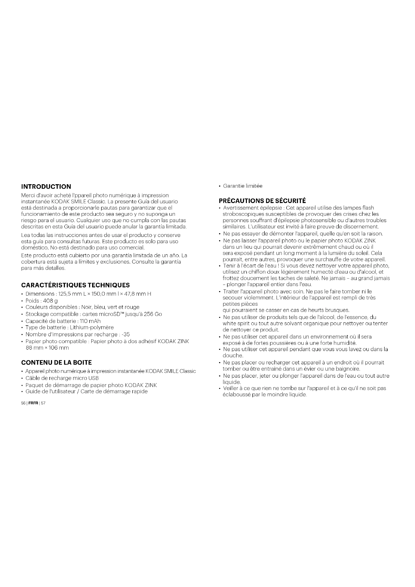 Dans la mesure où le droit ne l'interdit pas, cette garantie est exclusive et vient en lieu et place de toute autre garantie écrite, orale, légale, expresse ou implicite. À L'EXCEPTION DES GARANTIES EXPRESSES CONTENUES DANS LA DÉCLARATION DE GARANTIE LIMITÉE ET DANS LA MESURE OÙ CELA NE CONTREVIENT PAS À LA LOI, NOUS DÉCLINONS TOUTES LES AUTRES GARANTIES, EXPLICITES OU IMPLICITES, LÉGALES OU AUTRES, INCLUANT SANS LIMITATION, LES GARANTIES COMMERCIALES ET D'USAGE POUR UN BUT PARTICULIER. DANS LA MESURE OÙ CERTAINES JURIDICTIONS N'AUTORISENT PAS LA LIMITATION DES GARANTIES TACITES, CES INFORMATIONS PEUVENT NE PAS S’APPLIQUER À VOTRE CAS. DANS LA MESURE OÙ DE TELLES GARANTIES NE PEUVENT ÊTRE EN CONTRADICTION AVEC LES LOIS EN VIGUEUR SOUS VOTRE JURIDICTION, NOUS LIMITONS LA DURÉE ET LA PRISE EN CHARGE À LA DURÉE DE CETTE GARANTIE LIMITÉE EXPRESSE. NOTRE RESPONSABILITÉ QUANT AUX ARTICLES DÉFECTUEUX SE LIMITE À LA RÉPARATION, AU REMPLACEMENT OU AU REMBOURSEMENT COMME DÉCRIT CIDESSOUS DANS LA DÉCLARATION DE GARANTIE. QUI PEUT BÉNÉFICIER DE CETTE GARANTIE? C&A Marketing, Inc., situé 114 Tived Lane East, Edison, NJ, USA (« nous ») n'accorde cette garantie limitée qu'au client d'origine du produit (« vous»). Elle ne s'étend pas au propriétaire suivant ou à un bénéiciaire du transfert du produit. QUE COUVRE CETTE GARANTIE? Cette garantie limitée couvre les défauts dans le matériel et la fabrication de l'appareil photo numérique à impression instantanéeKODAK SMILE Classic 1 (« le Produit ») pour la période de garantie, telle que déinie ci-dessous. QU'EST-CE QUI N'EST PAS COUVERT PAR CETTE GARANTIE? Cette garantie limitée ne couvre pas les dégâts dus aux cas suivants: (a) transport ; (b) entreposage ; (c) mauvaise utilisation ; (d) non-respect des consignes d'utilisation du produit ou omission des opérations d'entretien préventif ; (e) modiications; (f) réparation non autorisée ; (g) usure normale ; ou (h) causes externes comme des accidents, usage abusif ou toute autre action ou événement au-delà de notre contrôle. QUELLE EST LA PÉRIODE DE COUVERTURE? Cette garantie limitée commence le jour de votre achat et dure pendant un an (la «Période de garantie »). La Période de garantie ne se prolonge pas si nous réparons ou remplaçons le produit. Nous pouvons changer à notre discrétion la disponibilité de cette garantie limitée, mais les changements ne seront pas rétroactifs. QUELS SONT VOS RECOURS SOUS CETTE GARANTIE? En cas de défectuosité du produit pendant la période de garantie, nous pourrons, à notre entière discrétion: (a) réparer ou remplacer le produit (ou la pièce70 | FR FR | 71 défectueuse) gratuitement ou (b) rembourser le prix d'achat du produit si une unité de remplacement ne peut être fournie. COMMENT BÉNÉFICIER DE LA GARANTIE? Pour bénéicier du service de garantie, vous devez nous contacter au +1 8445161539 ou par courriel à l'adresse kodak@camarketing.com pendant la Période de garantie pour obtenir un numéro d'autorisation de marchandise défectueuse («DMA», Defective Marchandise Authorization). Aucun service de garantie ne sera eectué sans numéro DMA et les frais de retour vers nos installations doivent être pris en charge par vous, l'acheteur. Nous prendrons à notre charge les frais d'expédition de l'unité de remplacement.