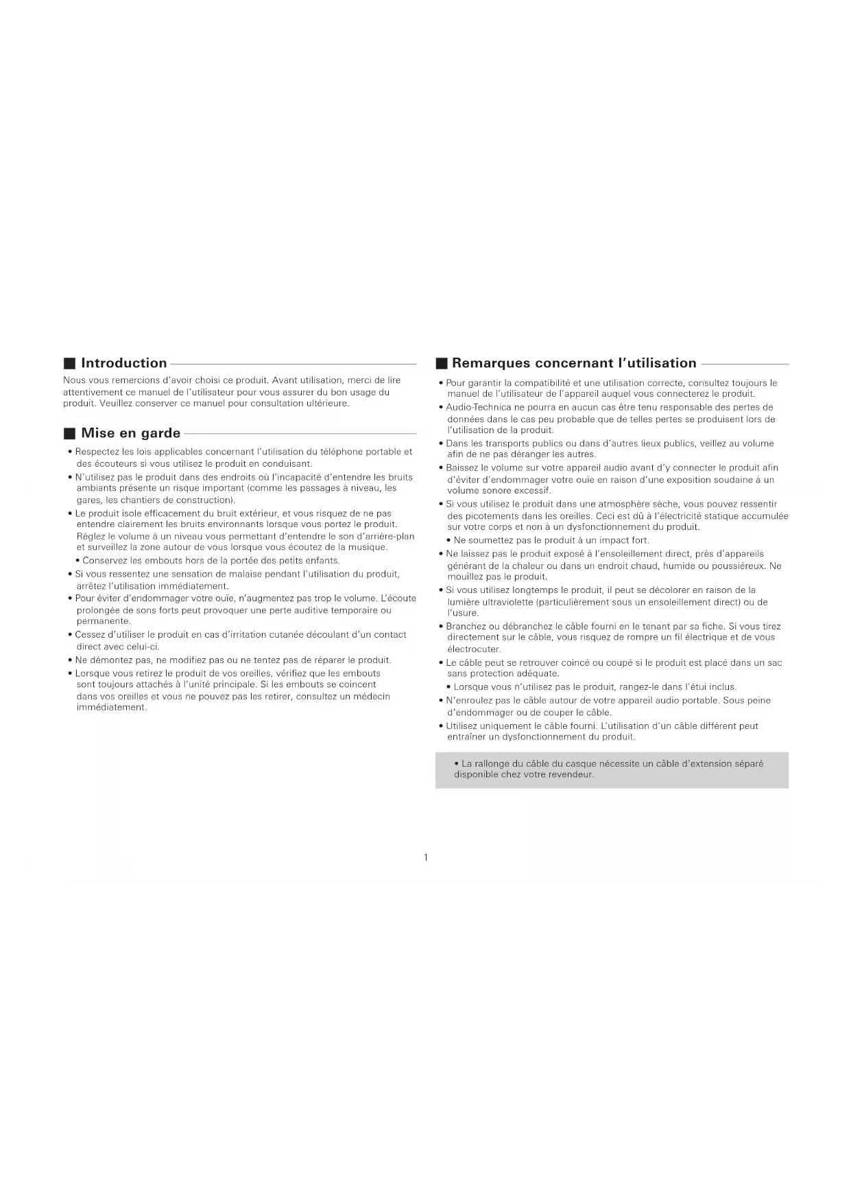 Hold the connector and push or pull in a straight motion as shown by the arrow. CableHeadphone Take care not to damage the pin in the headphone.1 Introduction Nous vous remercions d’avoir choisi ce produit. Avant utilisation, merci de lire attentivement ce manuel de l’utilisateur pour vous assurer du bon usage du produit. Veuillez conserver ce manuel pour consultation ultérieure. Mise en garde