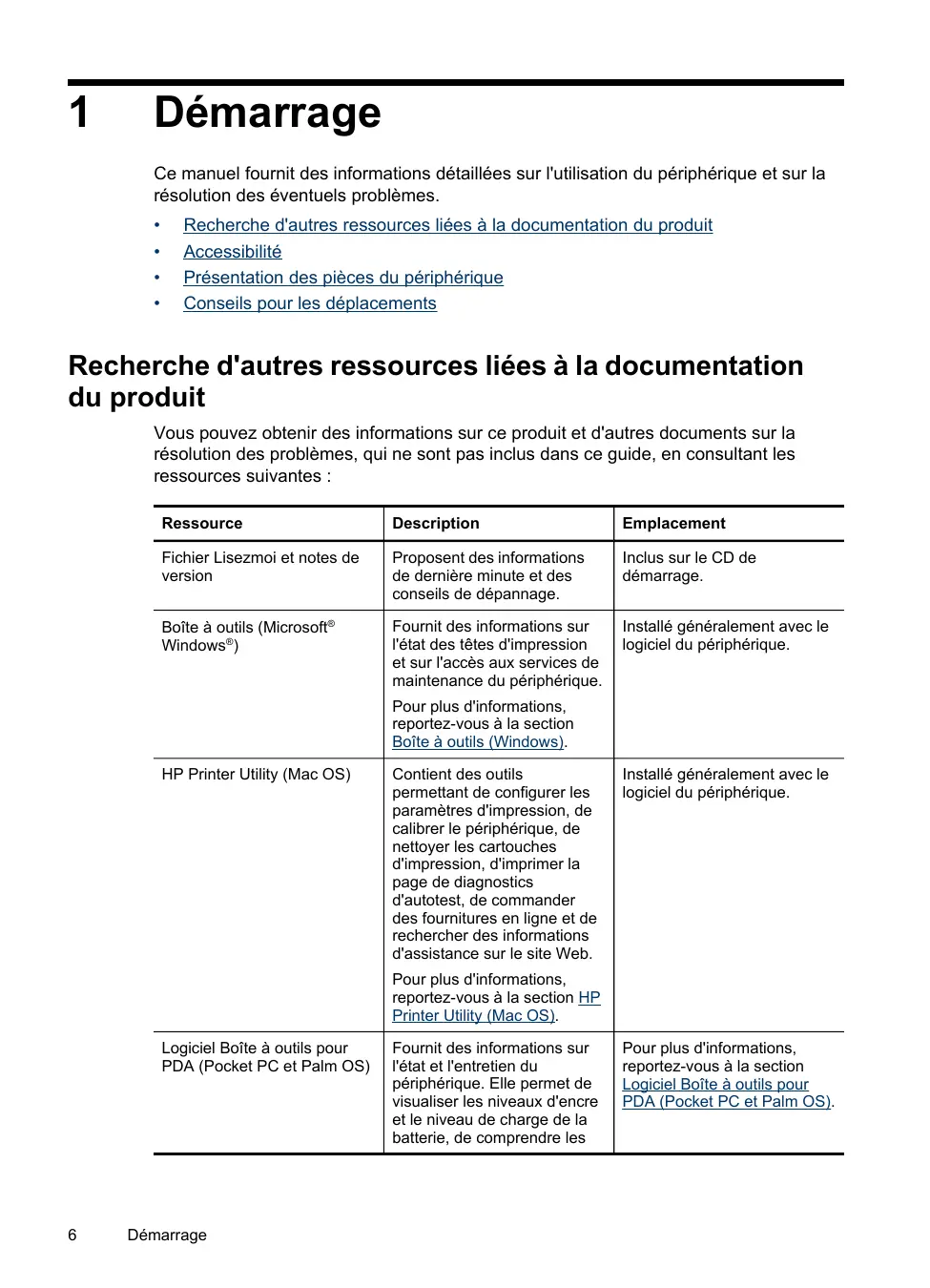 Recherche d'autres ressources liées à la documentation du produit Accessibilité Présentation des pièces du périphérique Conseils pour les déplacements Recherche d'autres ressources liées à la documentation du produit Vous pouvez obtenir des informations sur ce produit et d'autres documents sur la résolution des problèmes, qui ne sont pas inclus dans ce guide, en consultant les ressources suivantes : Ressource Description Emplacement Fichier Lisezmoi et notes de version Proposent des informations de dernière minute et des conseils de dépannage. Inclus sur le CD de démarrage. Boîte à outils (Microsoft® Windows®) Fournit des informations sur l'état des têtes d'impression et sur l'accès aux services de maintenance du périphérique. Installé généralement avec le logiciel du périphérique. Pour plus d'informations, reportez-vous à la section Boîte à outils (Windows). HP Printer Utility (Mac OS) Contient des outils permettant de configurer les paramètres d'impression, de calibrer le périphérique, de nettoyer les cartouches d'impression, d'imprimer la page de diagnostics d'autotest, de commander des fournitures en ligne et de rechercher des informations d'assistance sur le site Web. Installé généralement avec le logiciel du périphérique. Pour plus d'informations, reportez-vous à la section HP Printer Utility (Mac OS). Logiciel Boîte à outils pour PDA (Pocket PC et Palm OS)