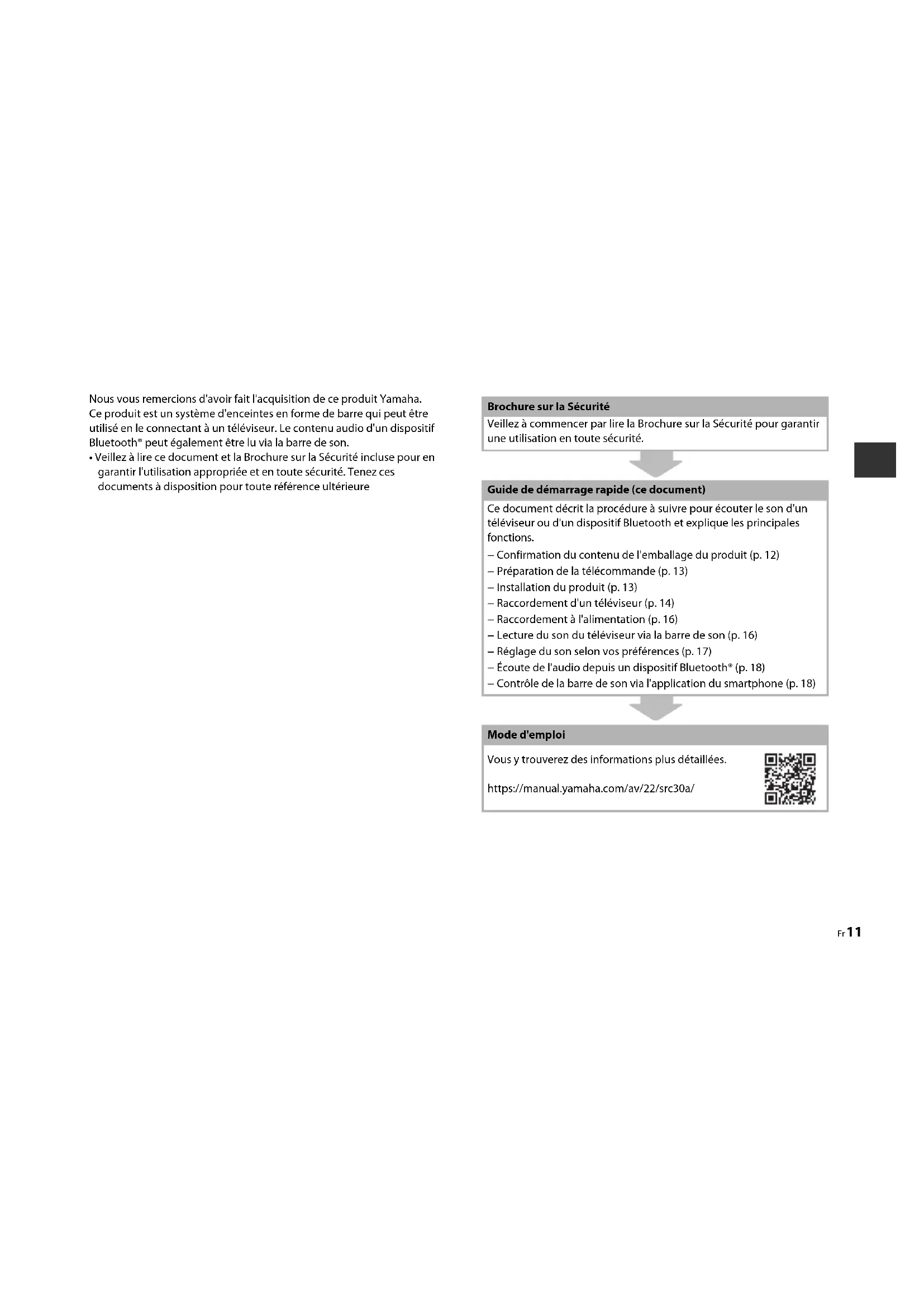 - Veillez à lire ce document et la Brochure sur la Sécurité incluse pour en garantir l'utilisation appropriée et en toute sécurité. Tenez ces documents à disposition pour toute référence ultérieure Brochure sur la Sécurité Veillez à commencer par lire la Brochure sur la Sécurité pour garantir une utilisation en toute sécurité. Guide de démarrage rapide (ce document) Ce document décrit la procédure à suivre pour écouter le son d'un téléviseur ou d'un dispositif Bluetooth et explique les principales fonctions. − Confirmation du contenu de l'emballage du produit (p. 12) − Préparation de la télécommande (p. 13) − Installation du produit (p. 13) − Raccordement d'un téléviseur (p. 14) − Raccordement à l'alimentation (p. 16) − Lecture du son du téléviseur via la barre de son (p. 16) − Réglage du son selon vos préférences (p. 17) − Écoute de l'audio depuis un dispositif Bluetooth® (p. 18) − Contrôle de la barre de son via l'application du smartphone (p. 18) Mode d'emploi Vous y trouverez des informations plus détaillées. https://manual.yamaha.com/av/22/src30a/ Guide de démarrage rapide FR12 Fr Ce produit comprend les principaux appareils et accessoires suivants. Sortez tous les articles de la boîte et assurez-vous qu'il ne manque rien. Confirmation du contenu de l'emballage du produit Barre de son (SR-CUC30A) Télécommande Câble audio optique numérique Cordons d'alimentation (×2) Gabarit de fixation Entretoises (A : ×2, B : x2, sur une 1 feuille) NOTE