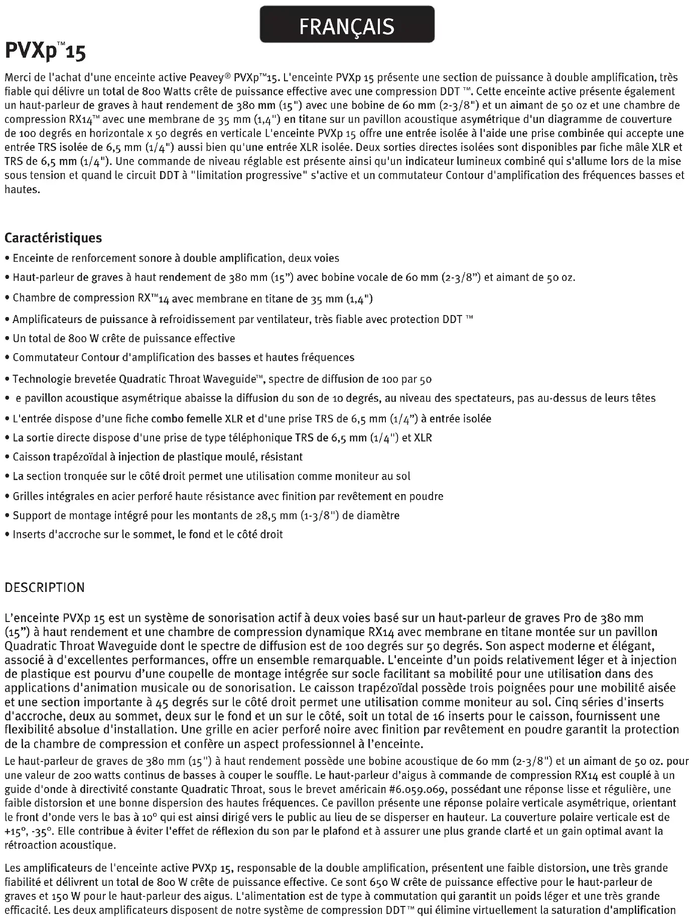 - Inserts d'accroche sur le sommet, le fond et le côté droit DESCRIPTION L’enceinte PVXp 15 est un système de sonorisation actif à deux voies basé sur un haut-parleur de graves Pro de 380 mm (15”) à haut rendement et une chambre de compression dynamique RX14 avec membrane en titane montée sur un pavillon Quadratic Throat Waveguide dont le spectre de diffusion est de 100 degrés sur 50 degrés. Son aspect moderne et élégant, associé à d'excellentes performances, offre un ensemble remarquable. L'enceinte d’un poids relativement léger et à injection de plastique est pourvu d’une coupelle de montage intégrée sur socle facilitant sa mobilité pour une utilisation dans des applications d'animation musicale ou de sonorisation. Le caisson trapézoïdal possède trois poignées pour une mobilité aisée et une section importante à 45 degrés sur le côté droit permet une utilisation comme moniteur au sol. Cinq séries d'inserts d'accroche, deux au sommet, deux sur le fond et un sur le côté, soit un total de 16 inserts pour le caisson, fournissent une flexibilité absolue d'installation. Une grille en acier perforé noire avec finition par revêtement en poudre garantit la protection de la chambre de compression et confère un aspect professionnel à l’enceinte. Le haut-parleur de graves de 380 mm (15") à haut rendement possède une bobine acoustique de 60 mm (2-3/8") et un aimant de 50 oz. pour une valeur de 200 watts continus de basses à couper le souffle. Le haut-parleur d’aigus à commande de compression RX14 est couplé à un guide d'onde à directivité constante Quadratic Throat, sous le brevet américain #6.059.069, possédant une réponse lisse et régulière, une faible distorsion et une bonne dispersion des hautes fréquences. Ce pavillon présente une réponse polaire verticale asymétrique, orientant le front d’onde vers le bas à 10° qui est ainsi dirigé vers le public au lieu de se disperser en hauteur. La couverture polaire verticale est de +15°, -35°. Elle contribue à éviter l'effet de réflexion du son par le plafond et à assurer une plus grande clarté et un gain optimal avant la rétroaction acoustique. Les amplificateurs de l'enceinte active PVXp 15, responsable de la double amplification, présentent une faible distorsion, une très grande fiabilité et délivrent un total de 800 W crête de puissance effective. Ce sont 650 W crête de puissance effective pour le haut-parleur de graves et 150 W pour le haut-parleur des aigus. L'alimentation est de type à commutation qui garantit un poids léger et une très grande efficacité. Les deux amplificateurs disposent de notre système de compression DDT
