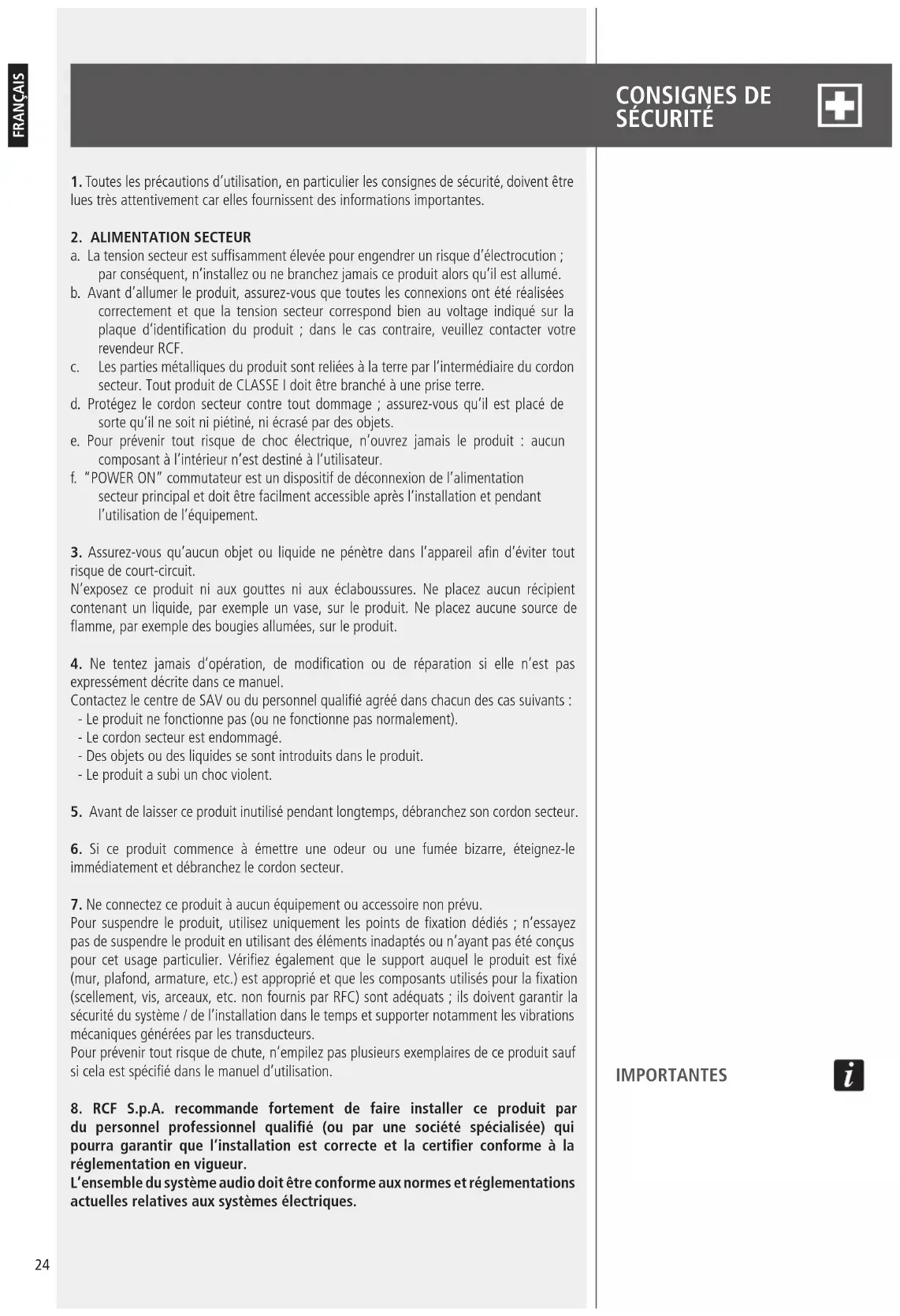 8. RCF S.p.A. recommande fortement de faire installer ce produit par